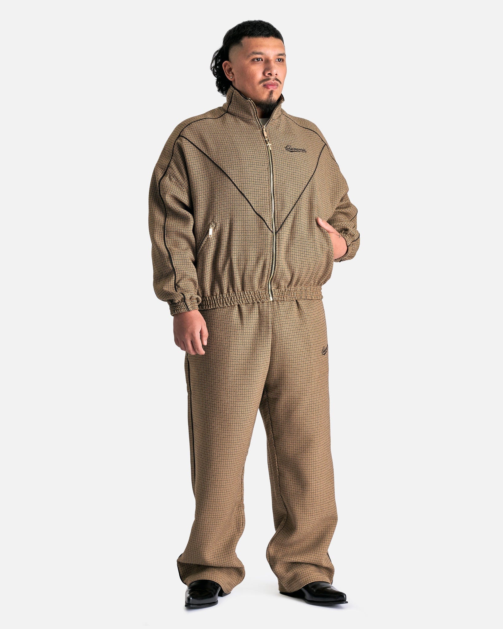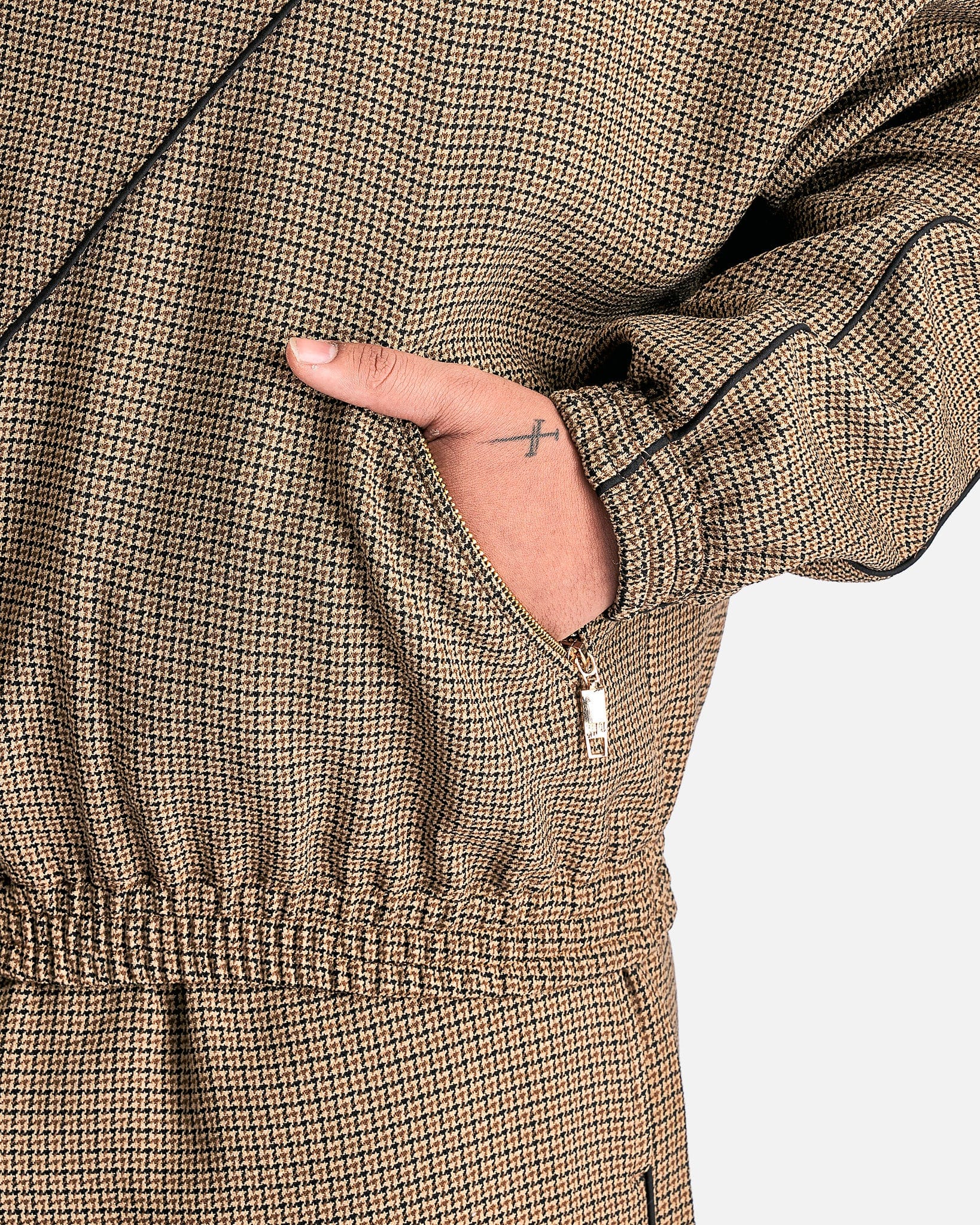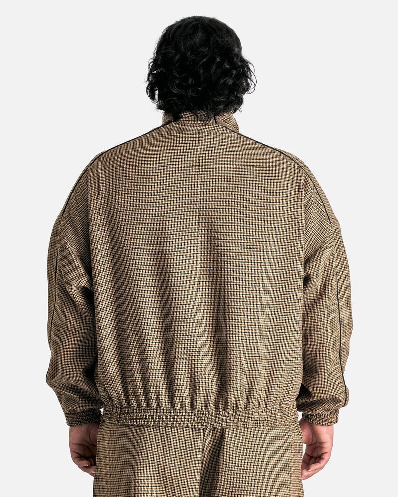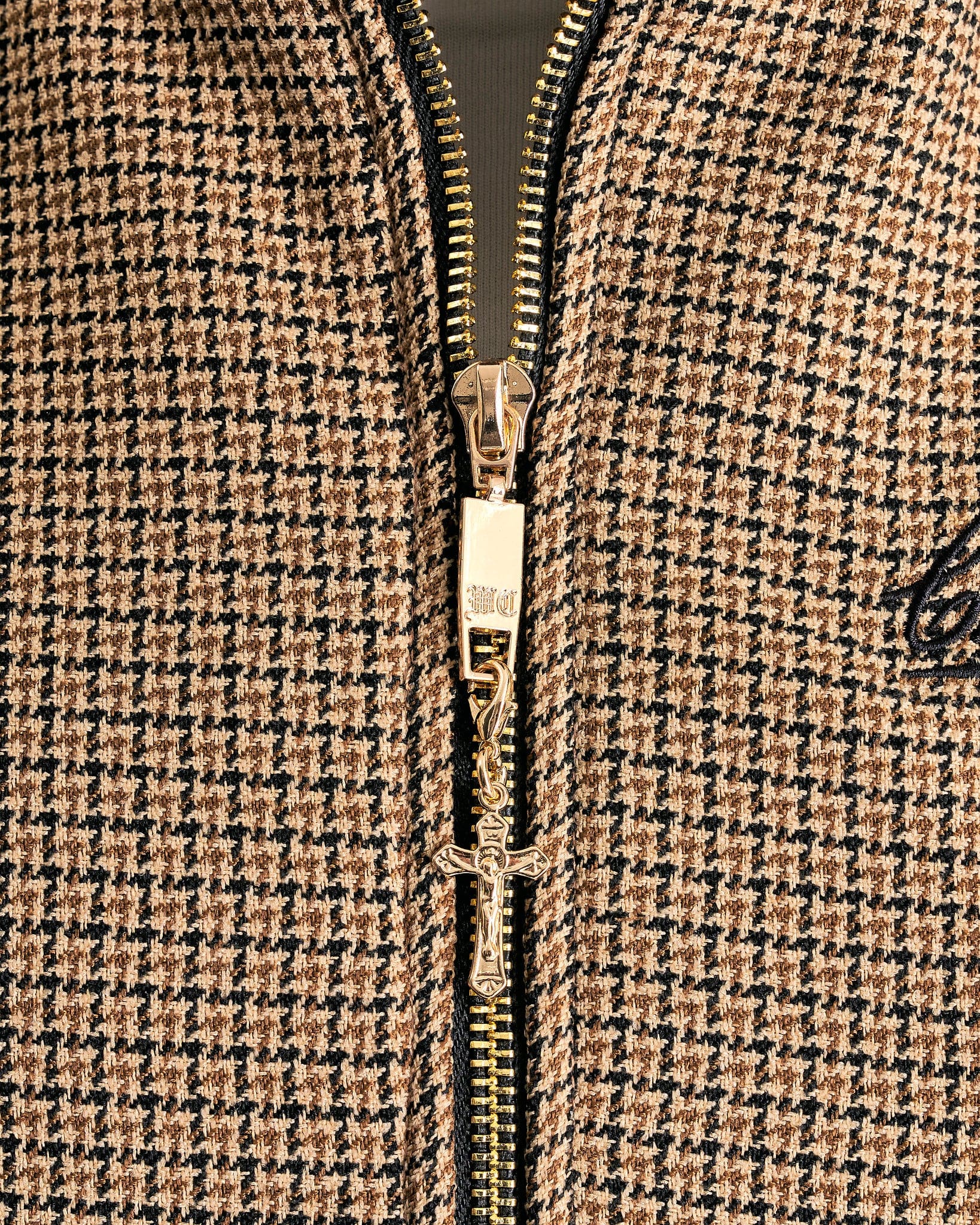 Willy Chavarria Ruff Rider Track Jacket in Gold. This gold patterned track jacket features a stand collar, front zip closure with crucifix detail, "script" lettering on the front left chest, side zip pockets and elasticated cuffs and hem.