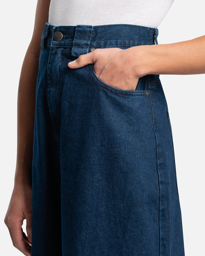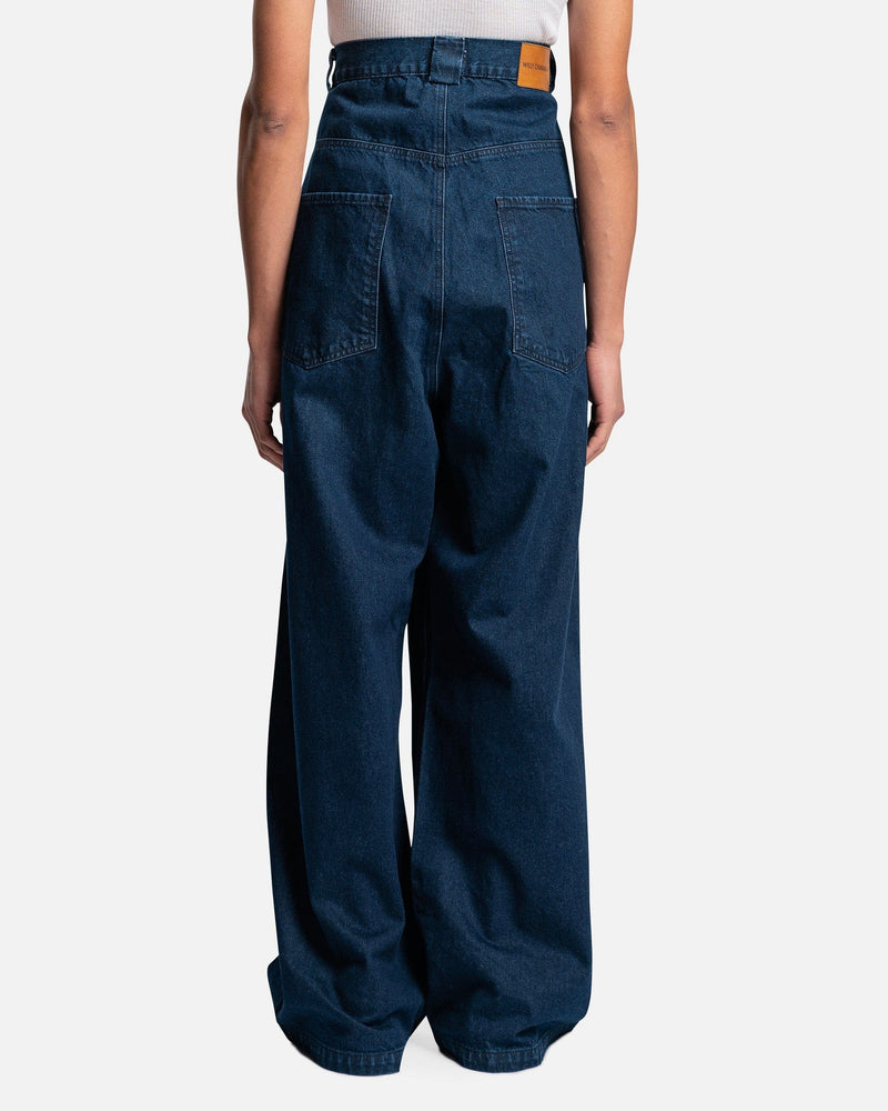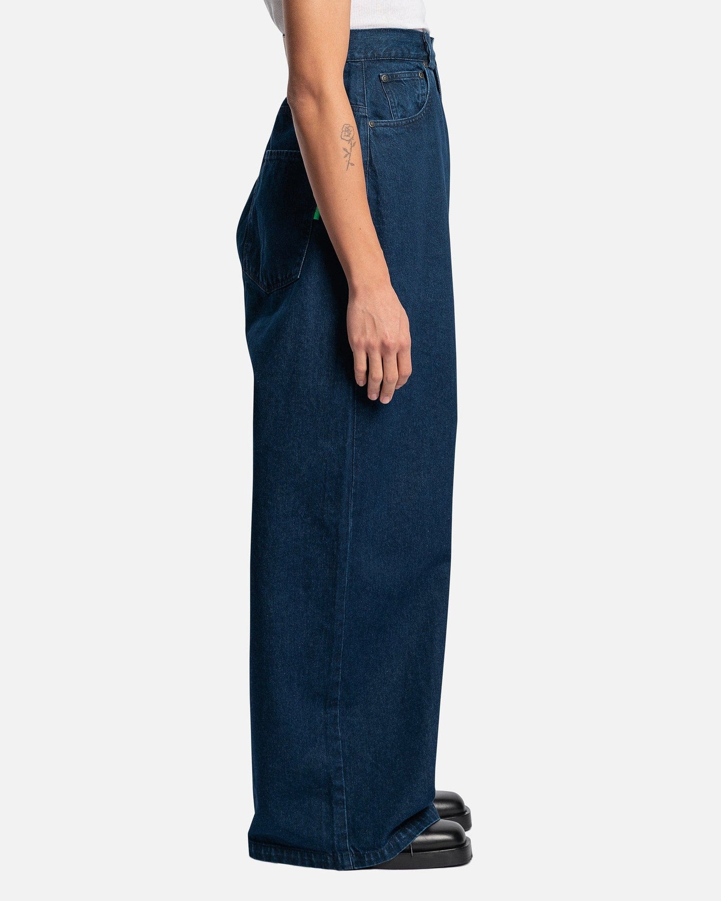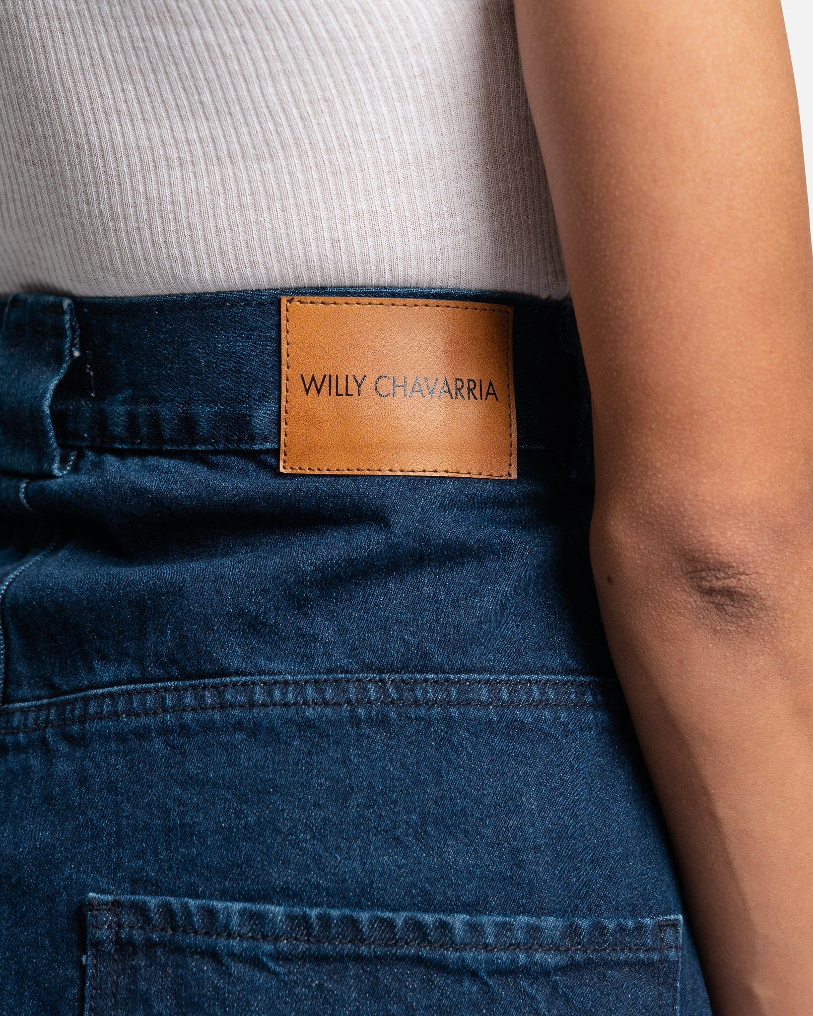 WILLY CHAVARRIA men's jeans in blue. These wide leg jeans feature a five pockets, a button front, and a zipper fly. The waist has a leather debossed logo patch embroidered on the back.