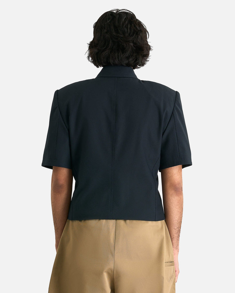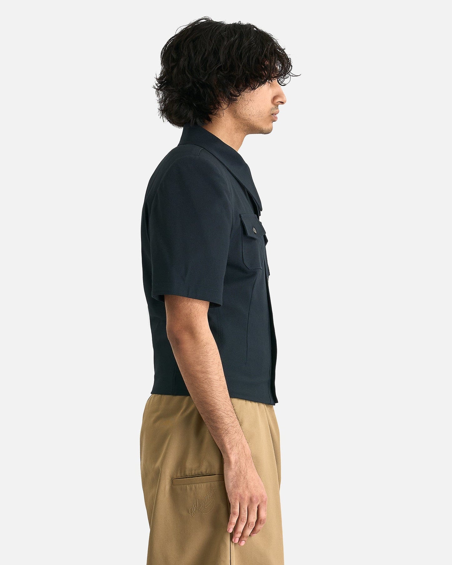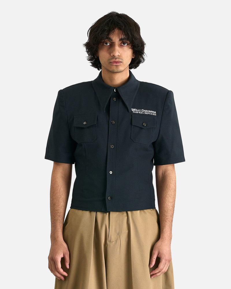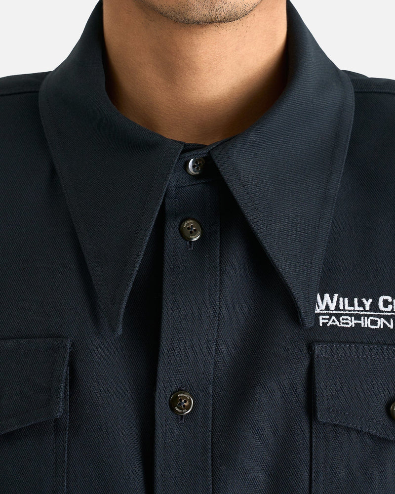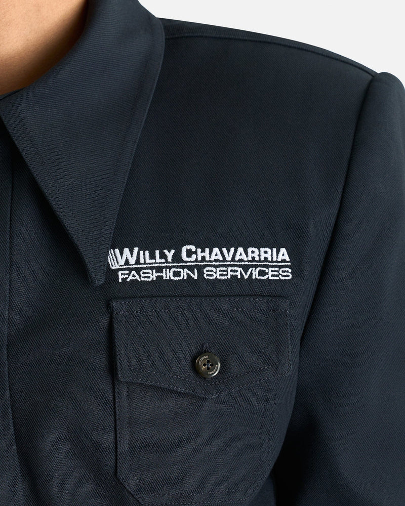 Willy Chavarria Staple Work Shirt in Navy. This tailored shirt is crafted from a heavyweight cotton twill and features a pointed collar, center button closure, padded shoulders and chest pockets with button fastening.