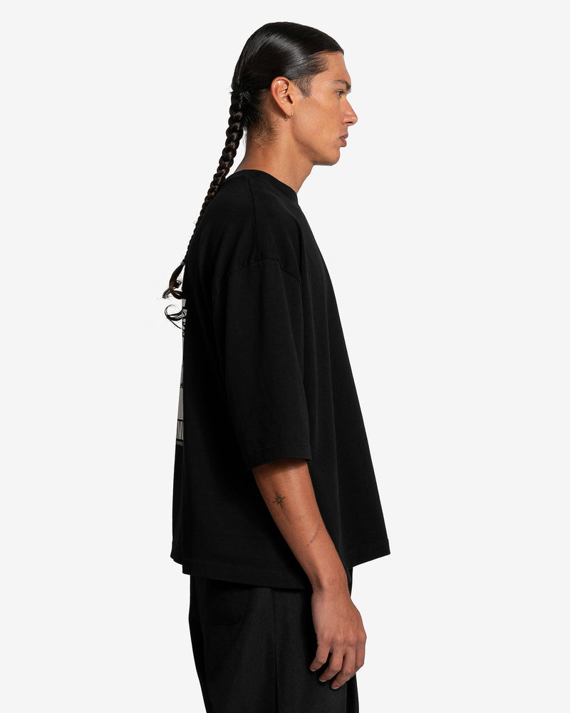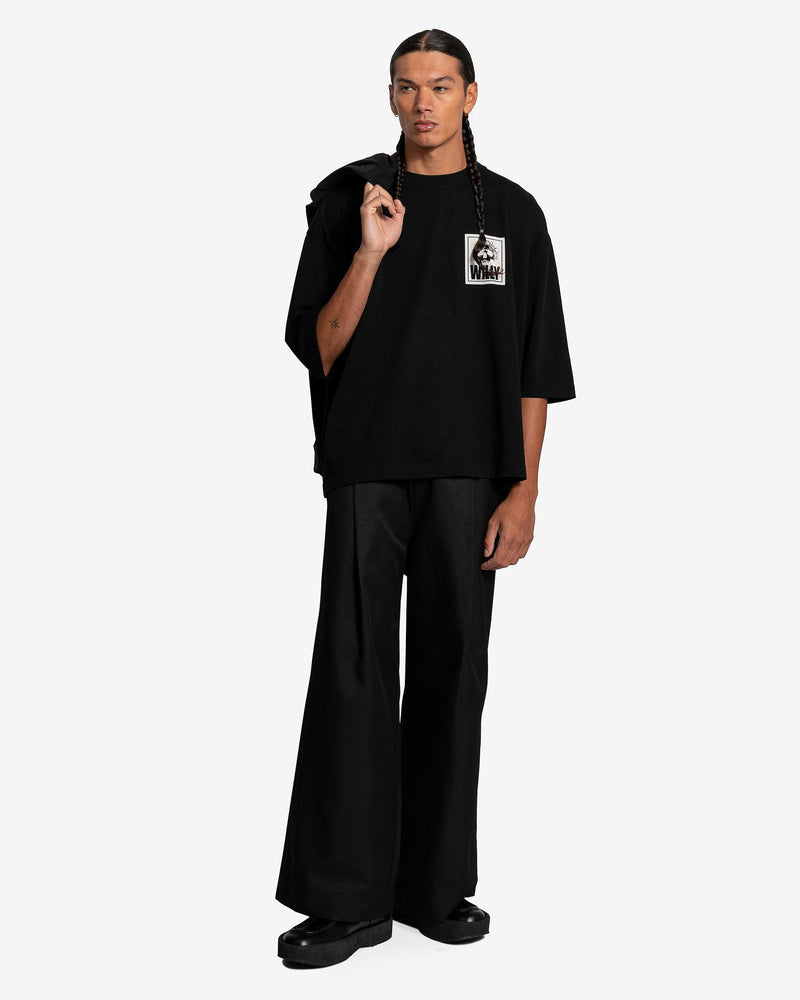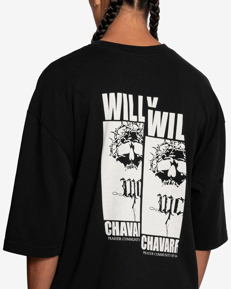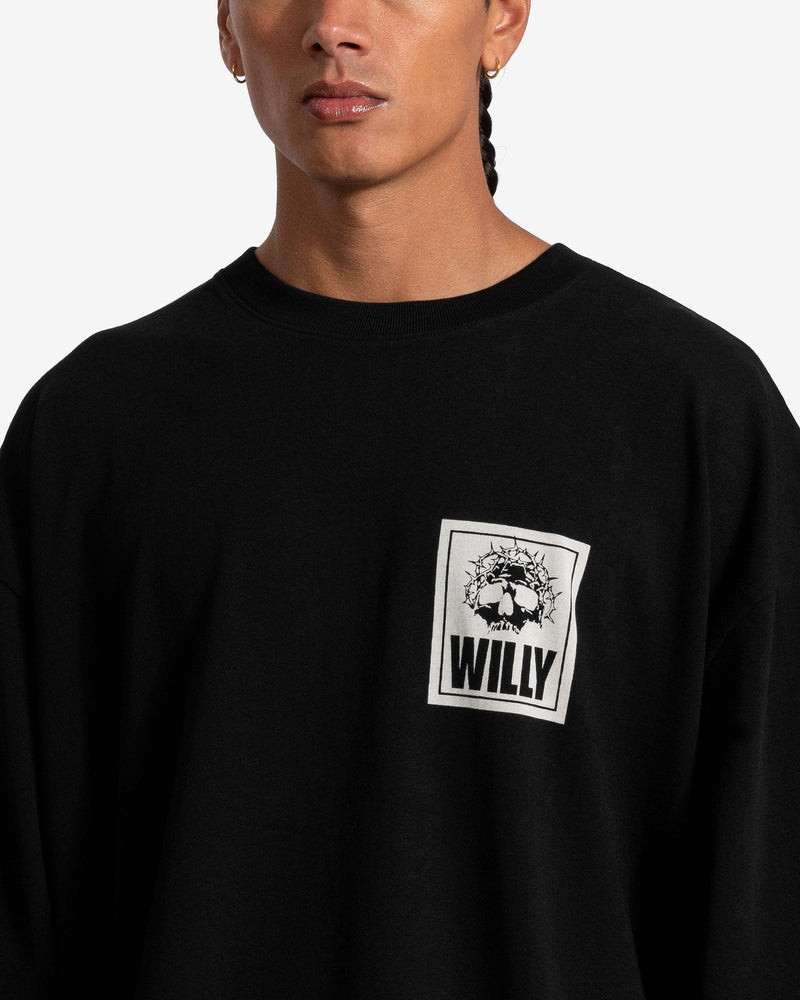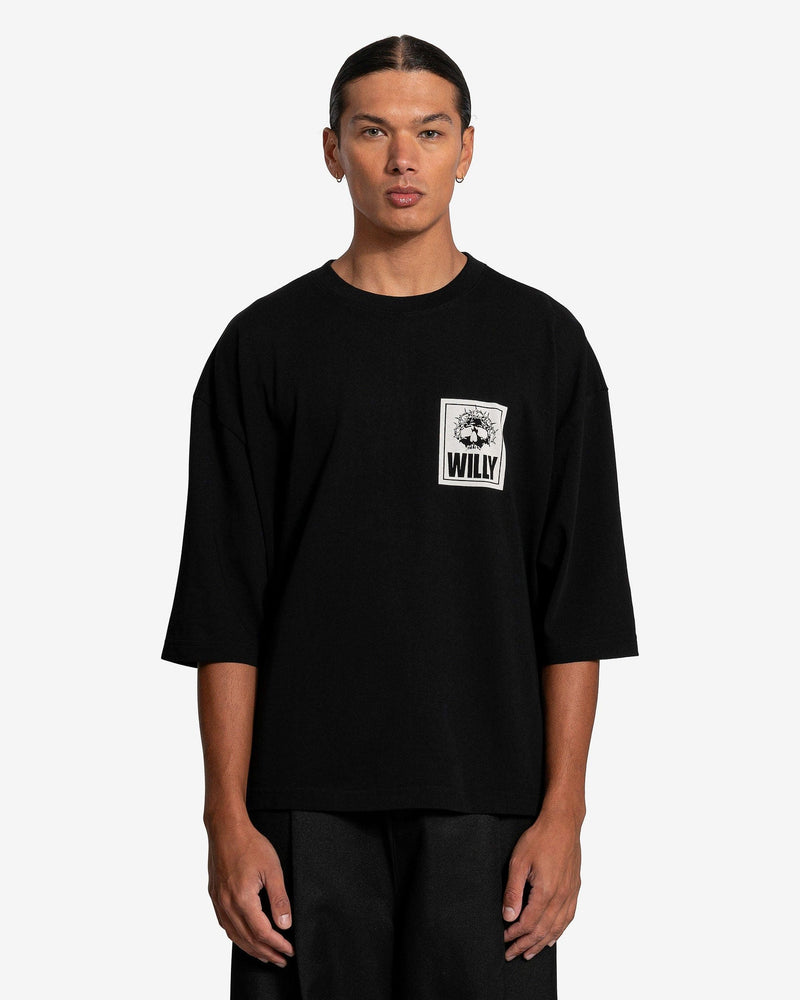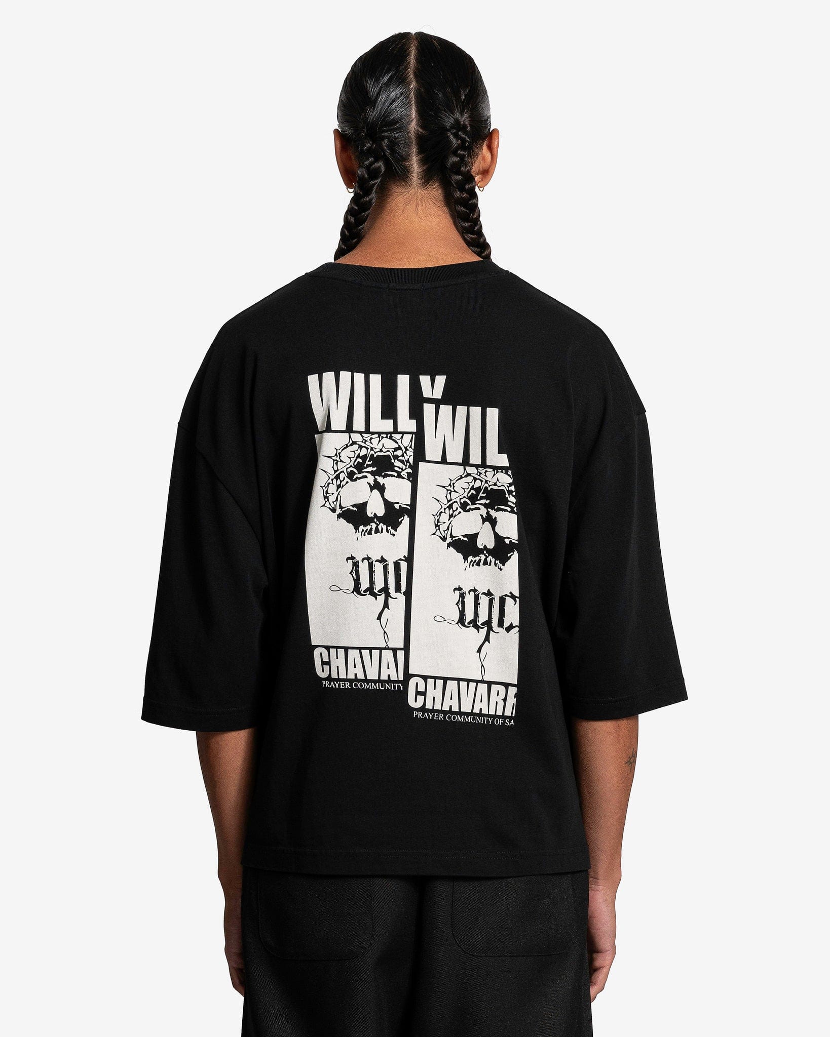 Willy Chavarria men’s Willy Skull Square SS Buffalo T-Shirt in Solid Black. This short sleeve shirt is in collaboration with graphic designer, Tom Tosseyn. The shirt features a silkscreen graphic on both the front and back of the shirt along with a ribbed collar and cuffs and drop shoulder seams.