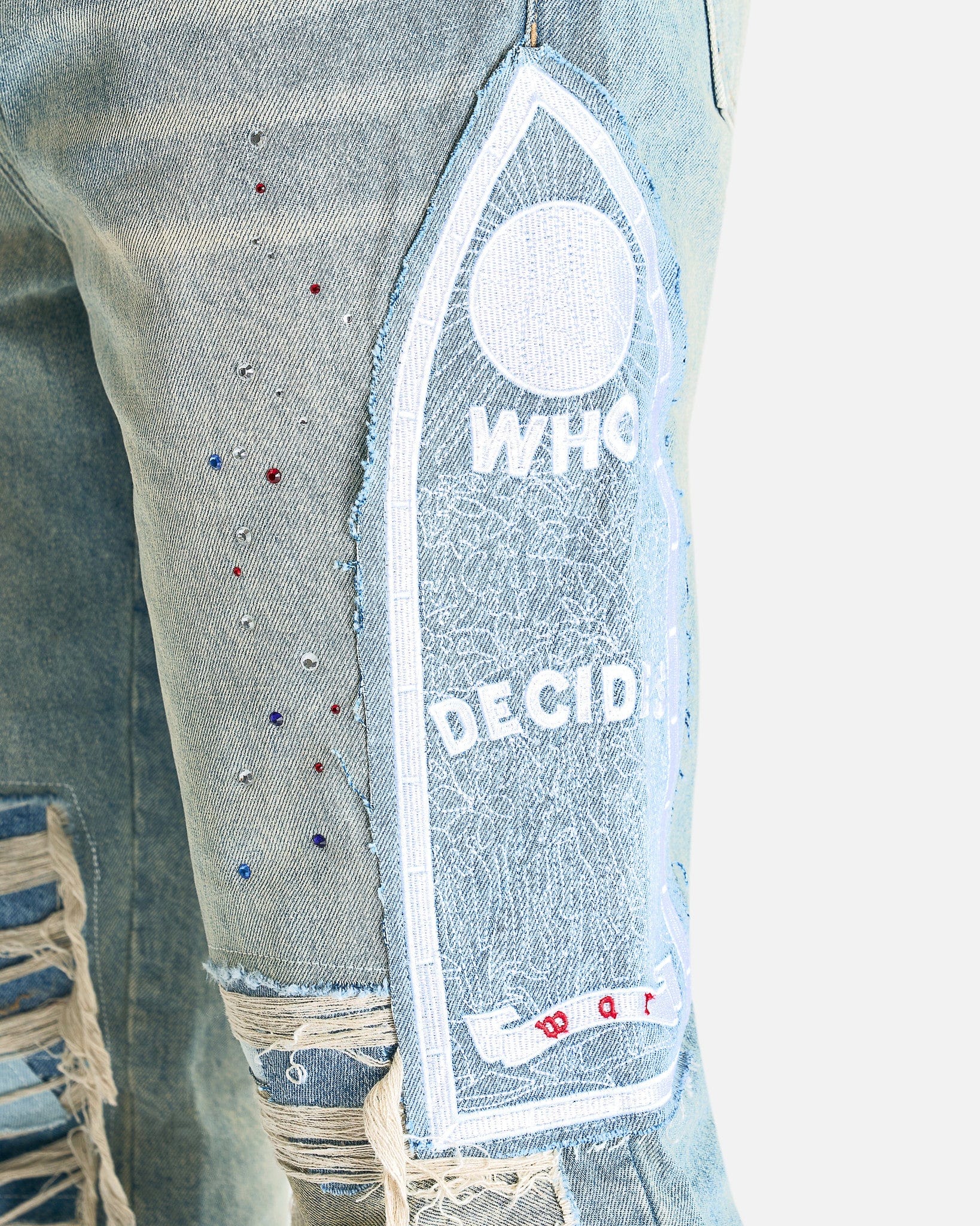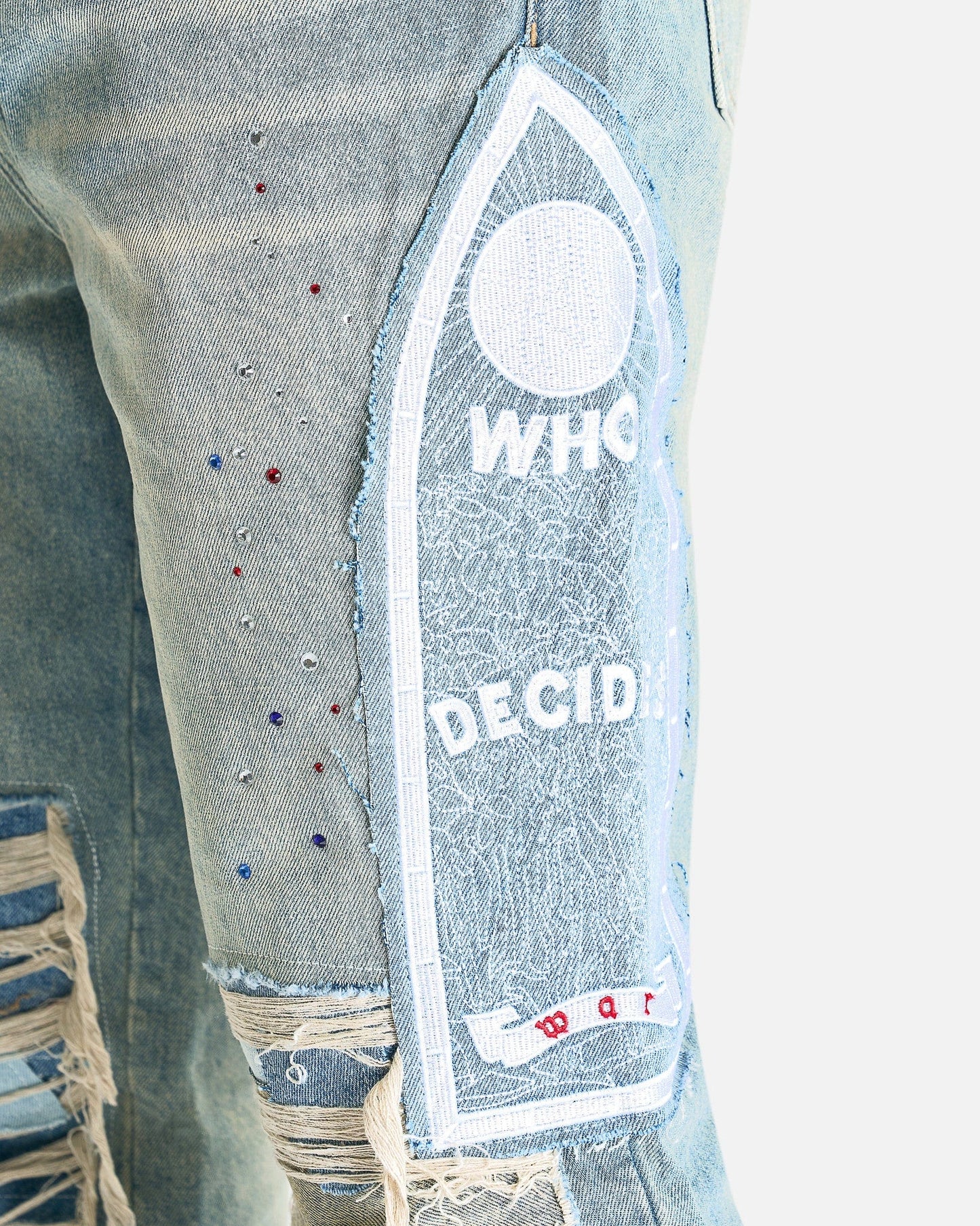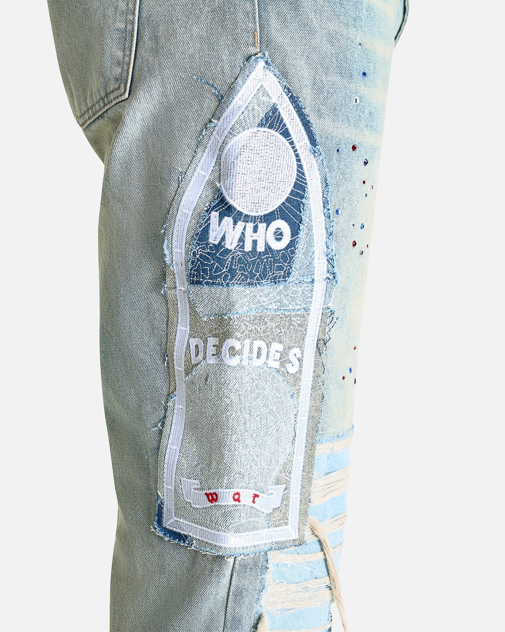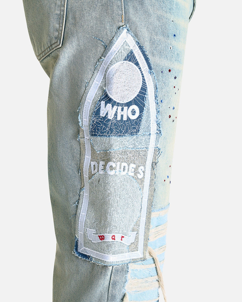 Who Decides War Blown Denim in Sky. These pants are crafted from a non-stretch cotton denim and feature a zip fly and button closure, 5-pocket styling, crystal cut and embroidered appliqués, leather logo patch at back and distressed detailing.