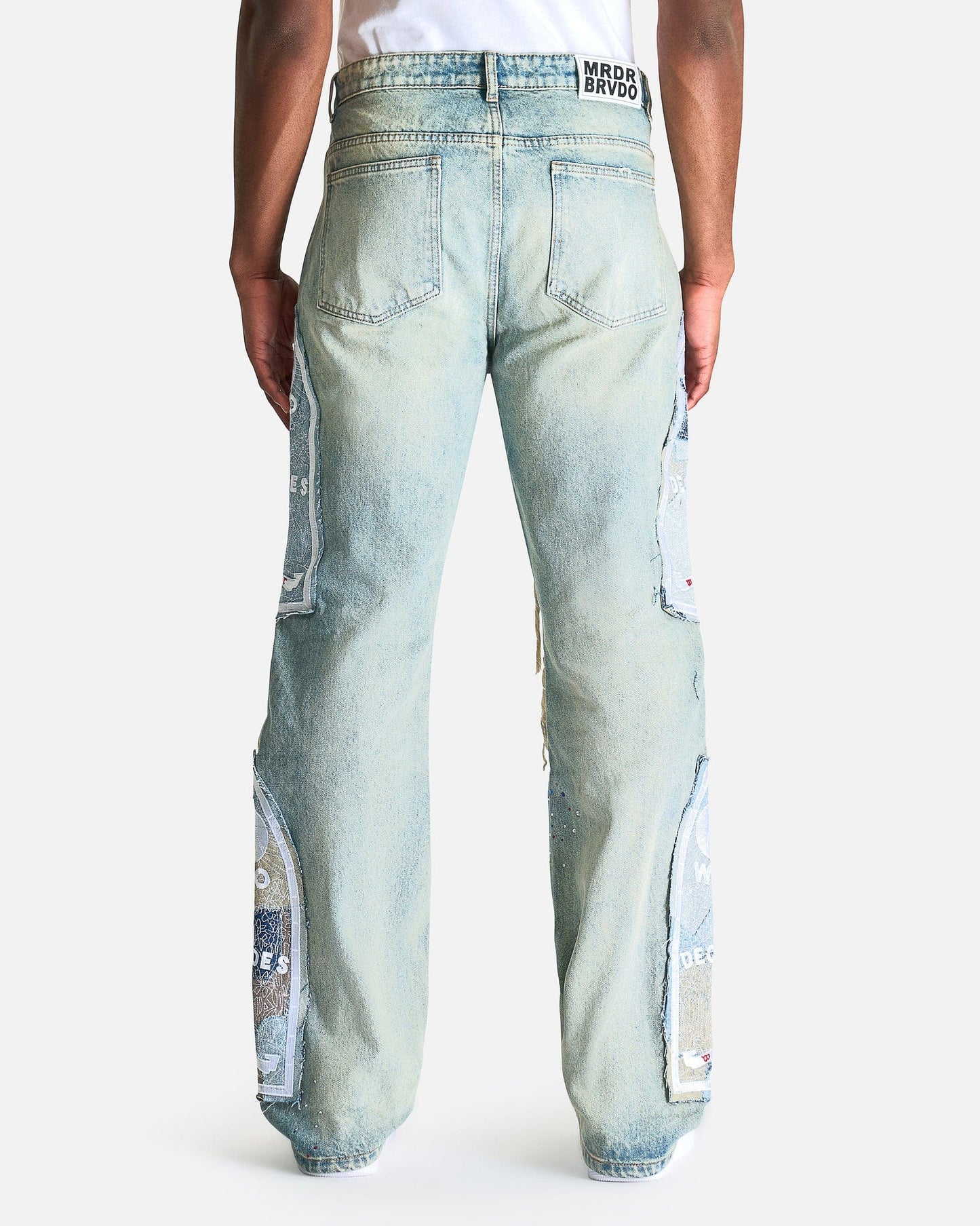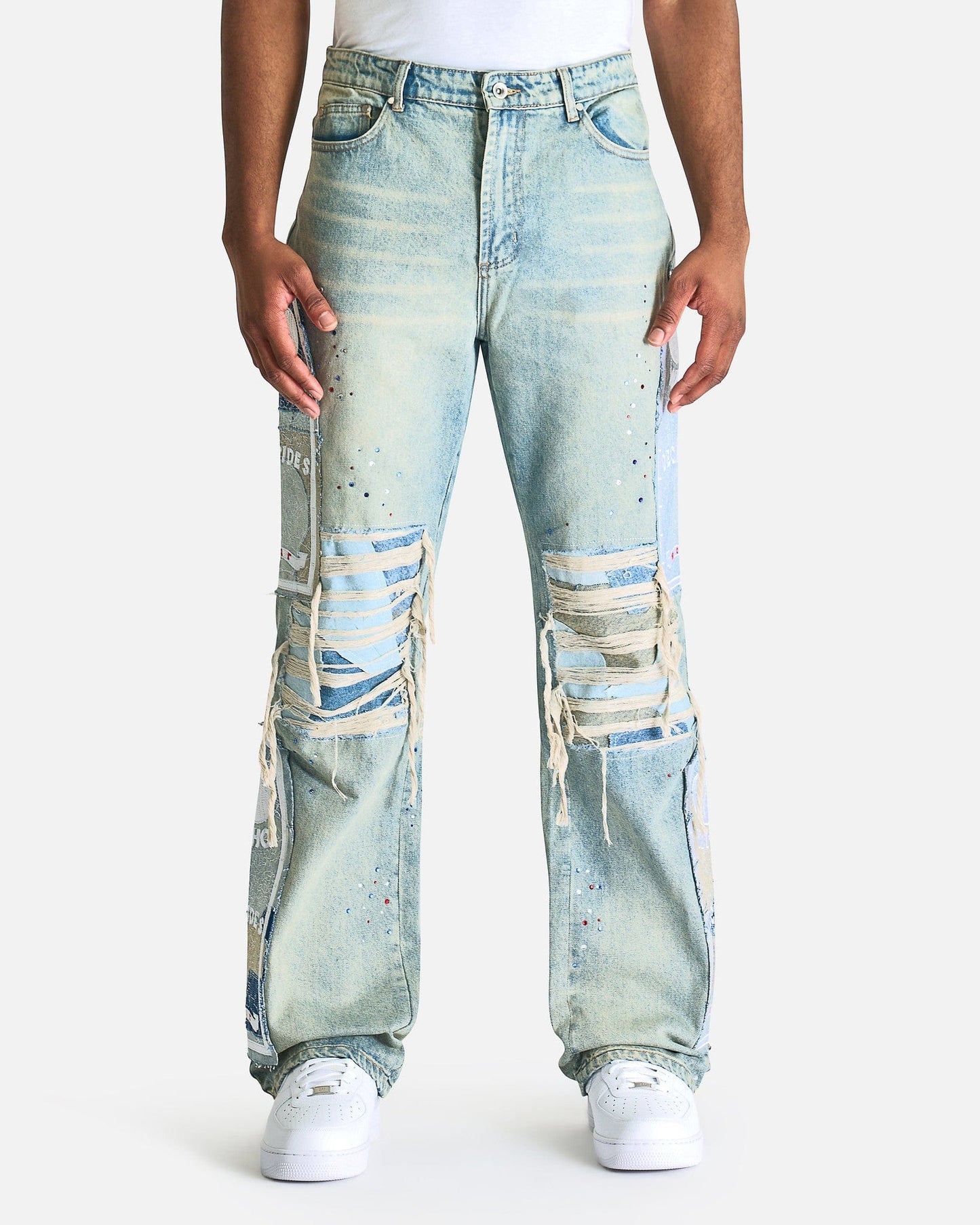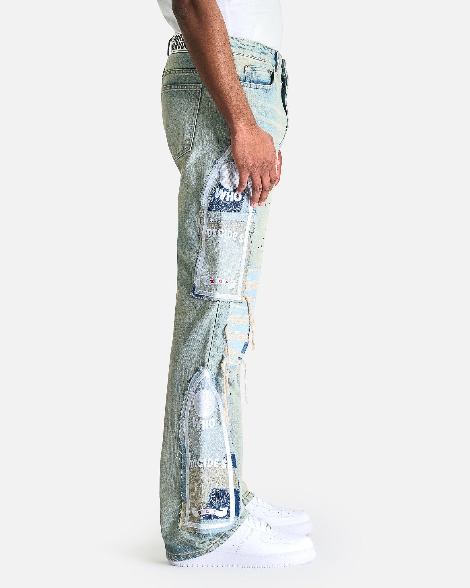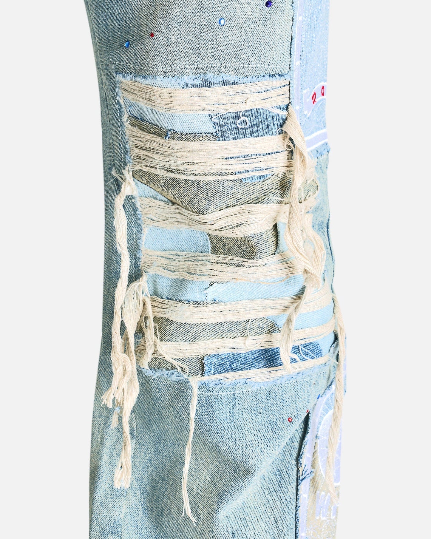 Who Decides War Blown Denim in Sky. These pants are crafted from a non-stretch cotton denim and feature a zip fly and button closure, 5-pocket styling, crystal cut and embroidered appliqués, leather logo patch at back and distressed detailing.