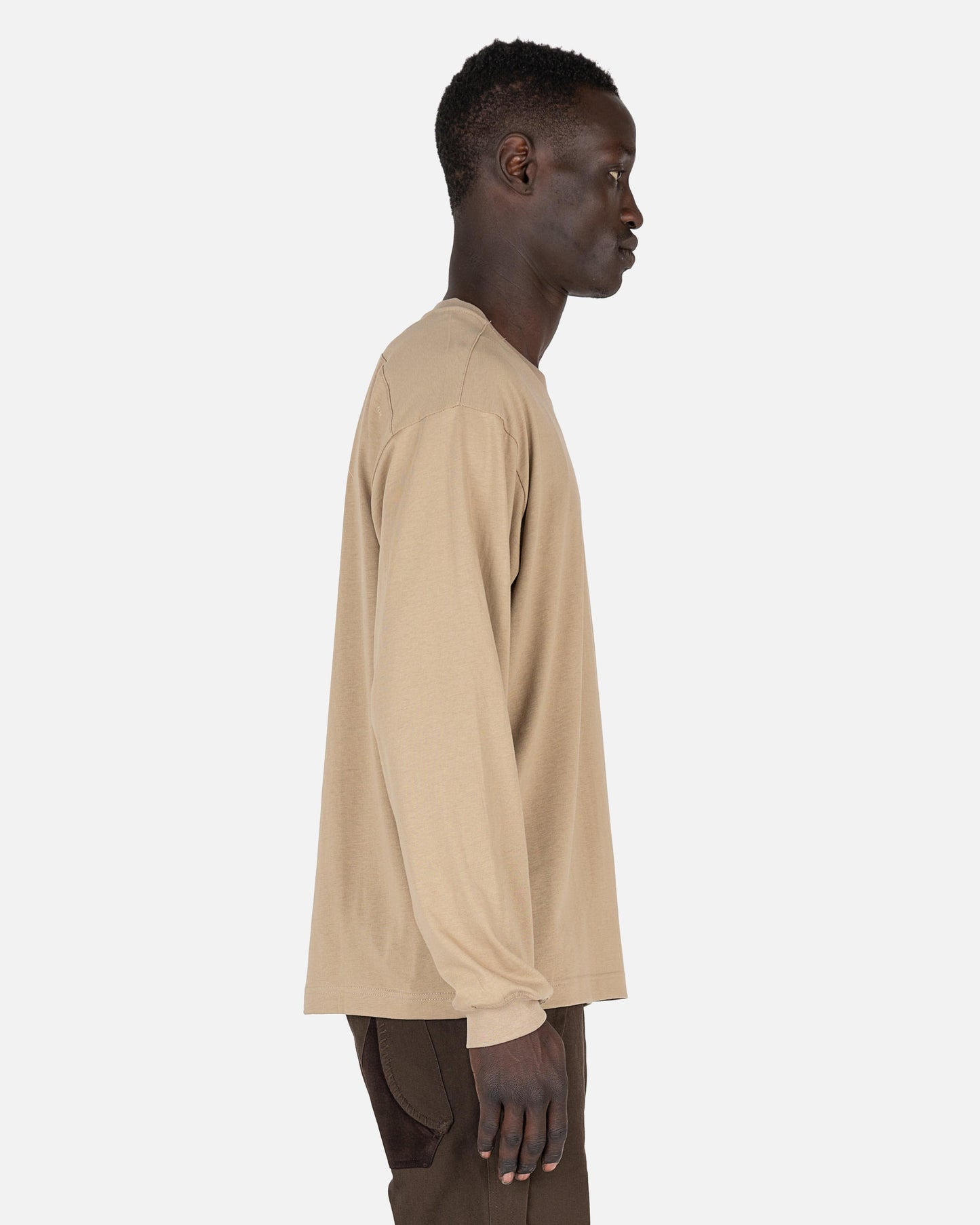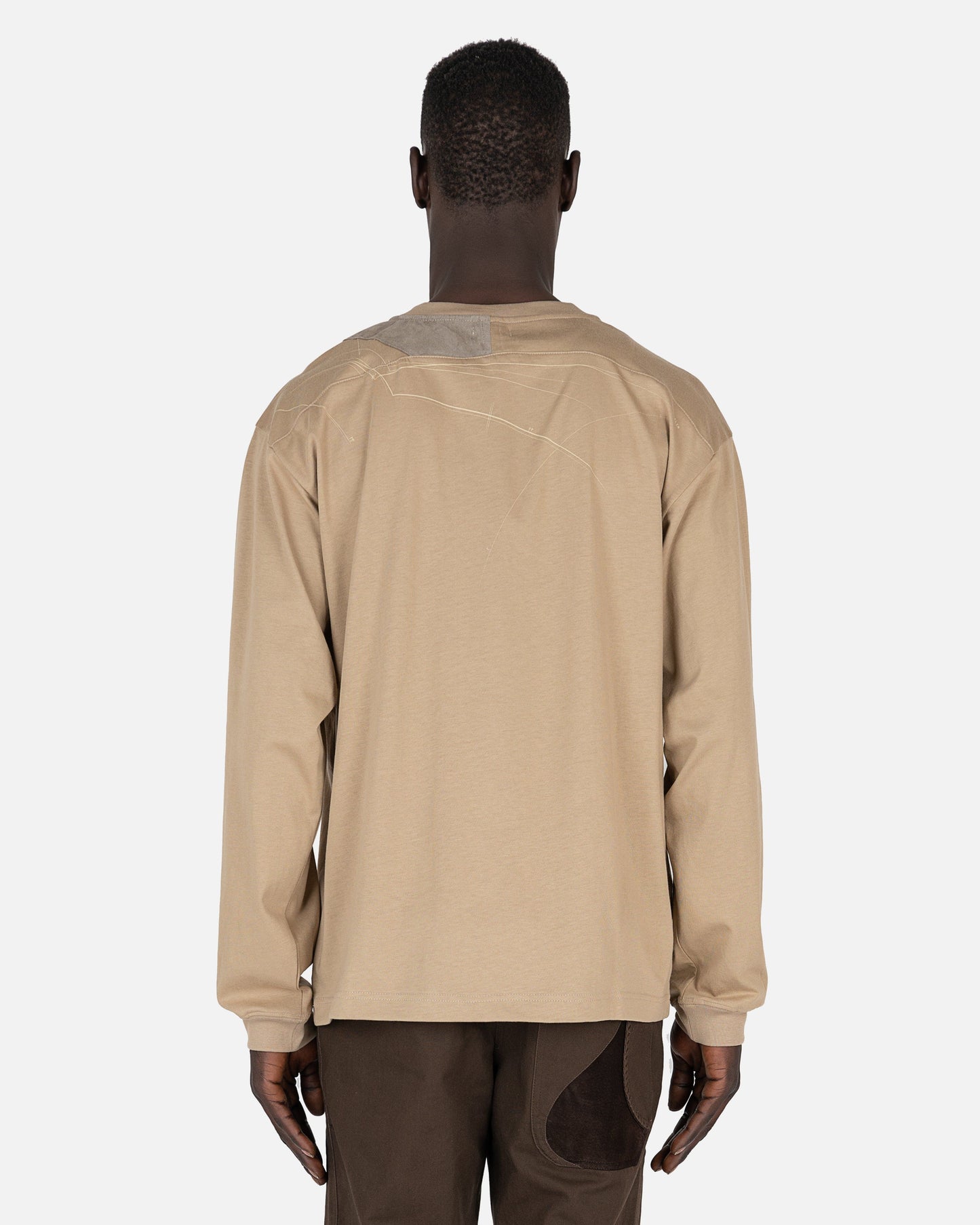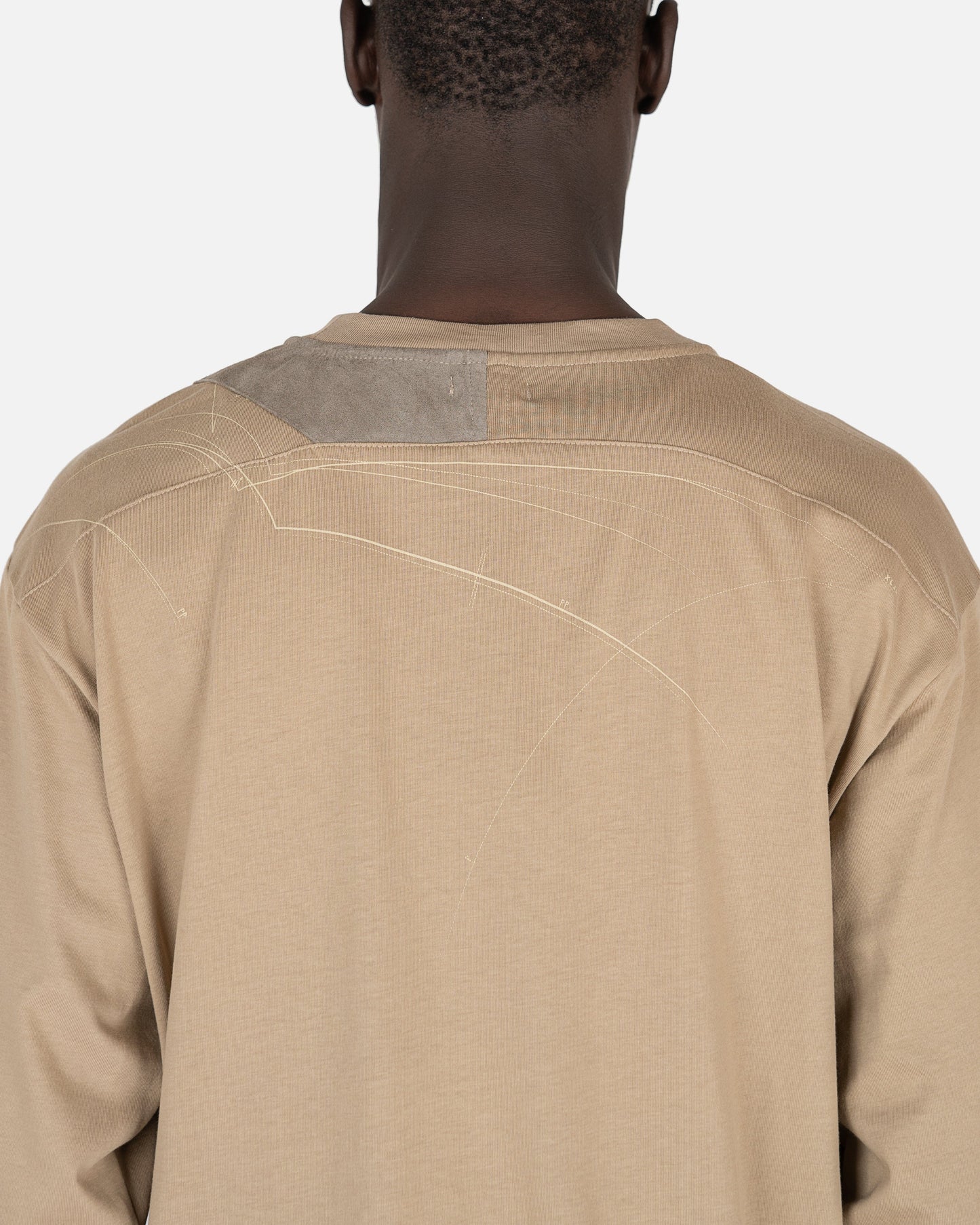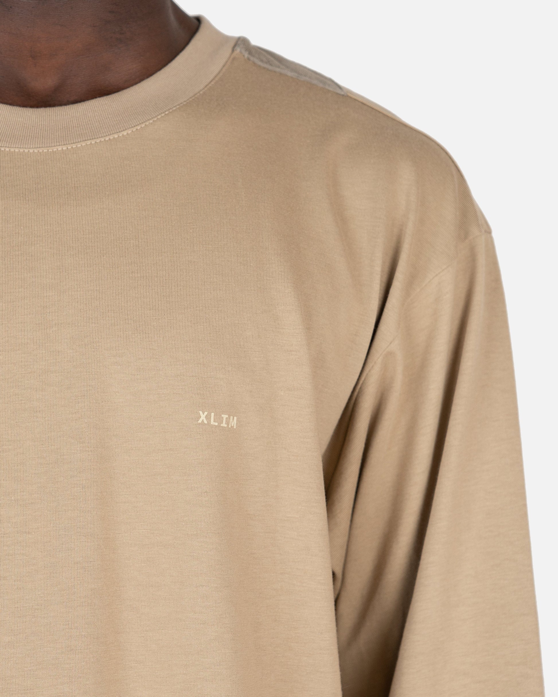 XLIM men's longsleeve logo t-shirt in beige. This shirt features a crew neckline and the XLIM logo printed on the front left chest. The back has suede shoulder patches and the Ep. 2 sketch print along the shoulders.