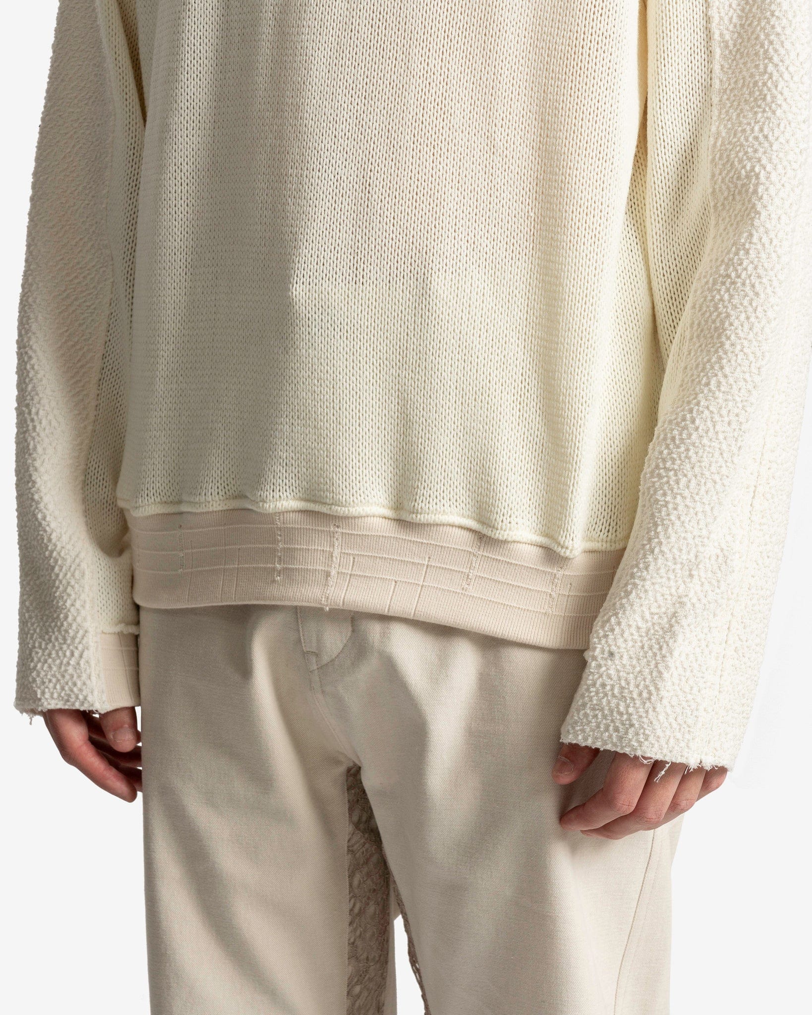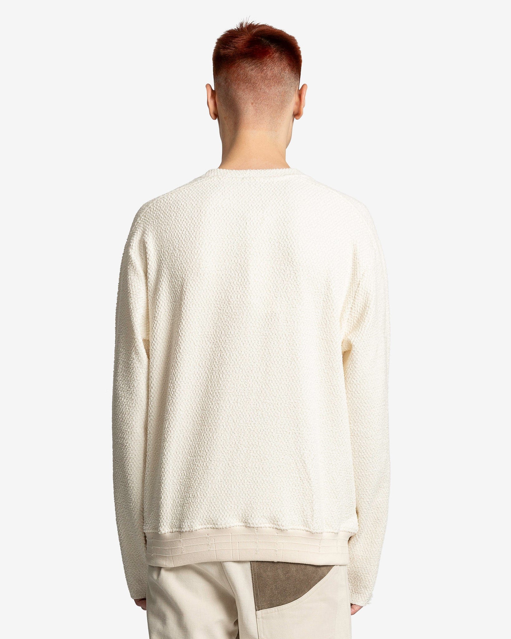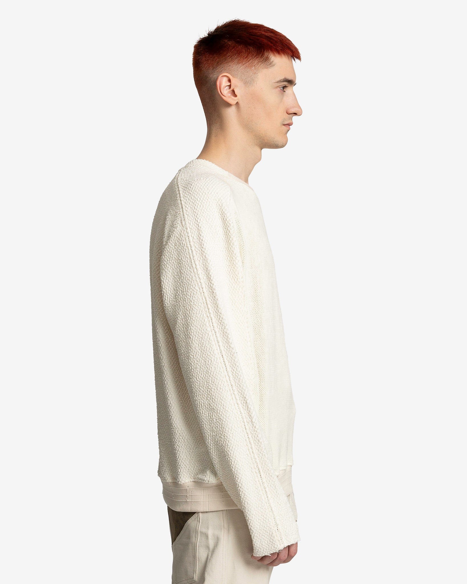XLIM men's knit crewneck in white. This top features a ribbed knit composition with cutout seam details and jacquard fabric throughout.