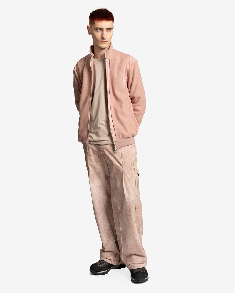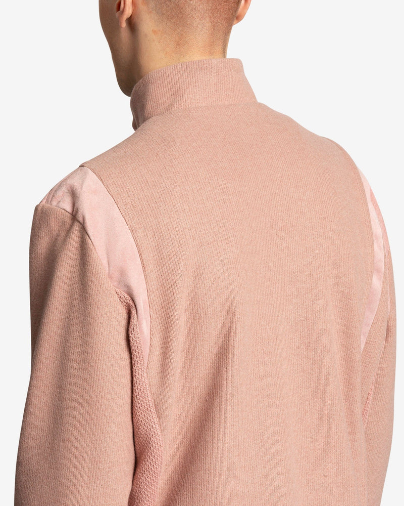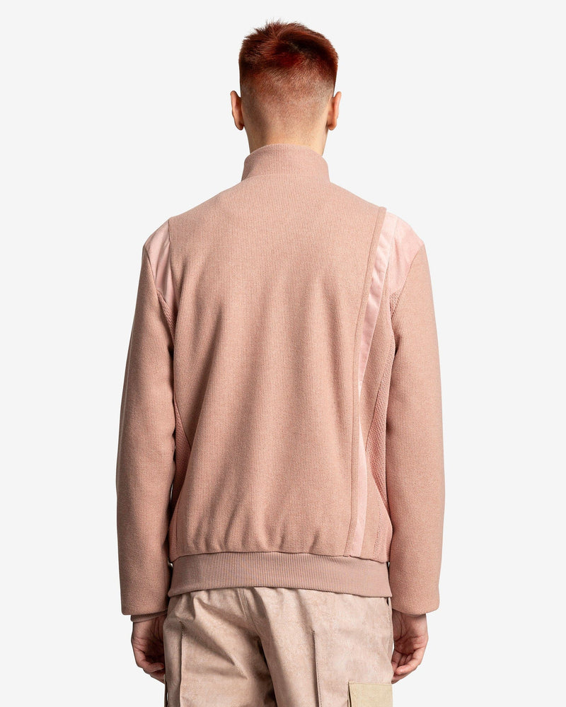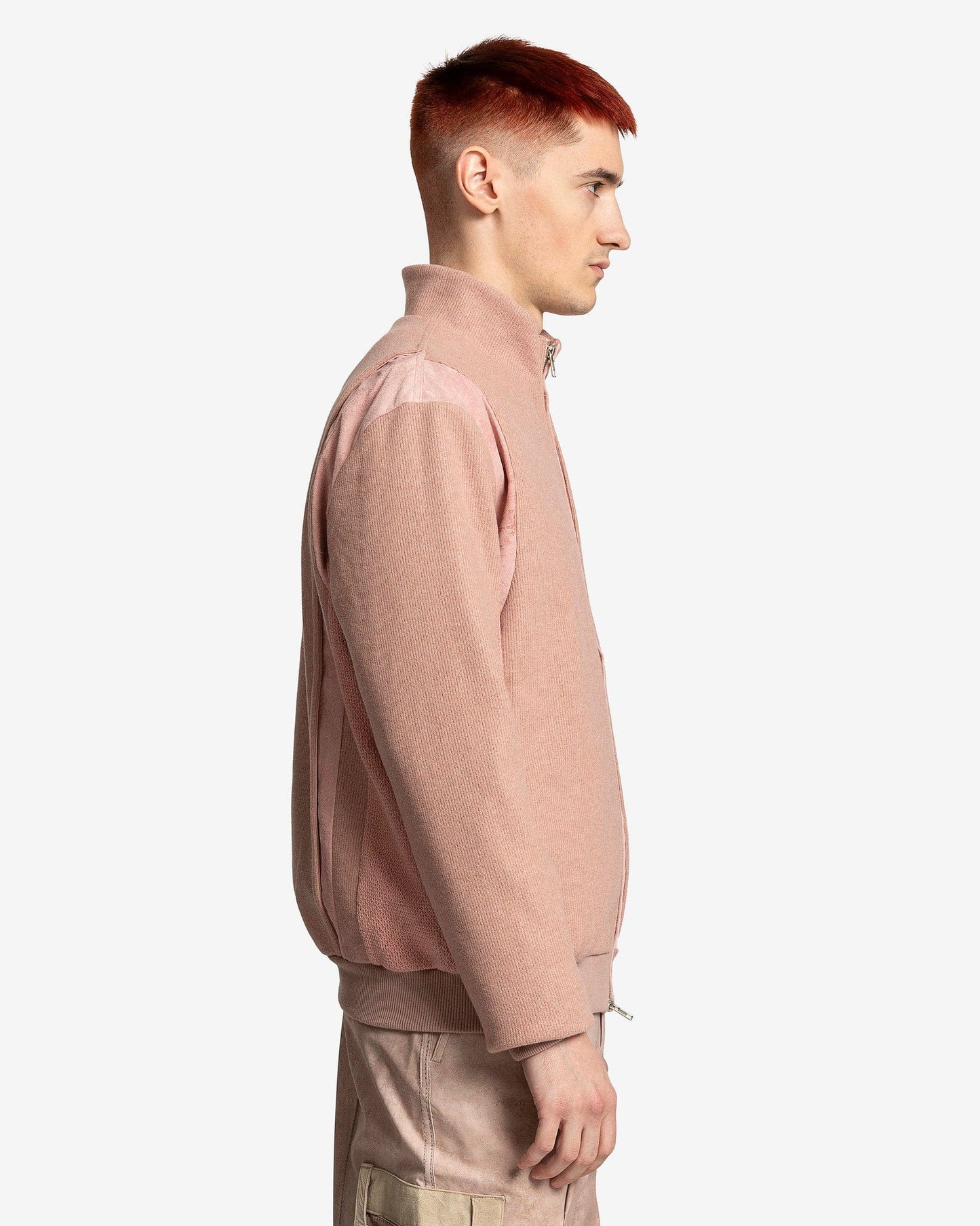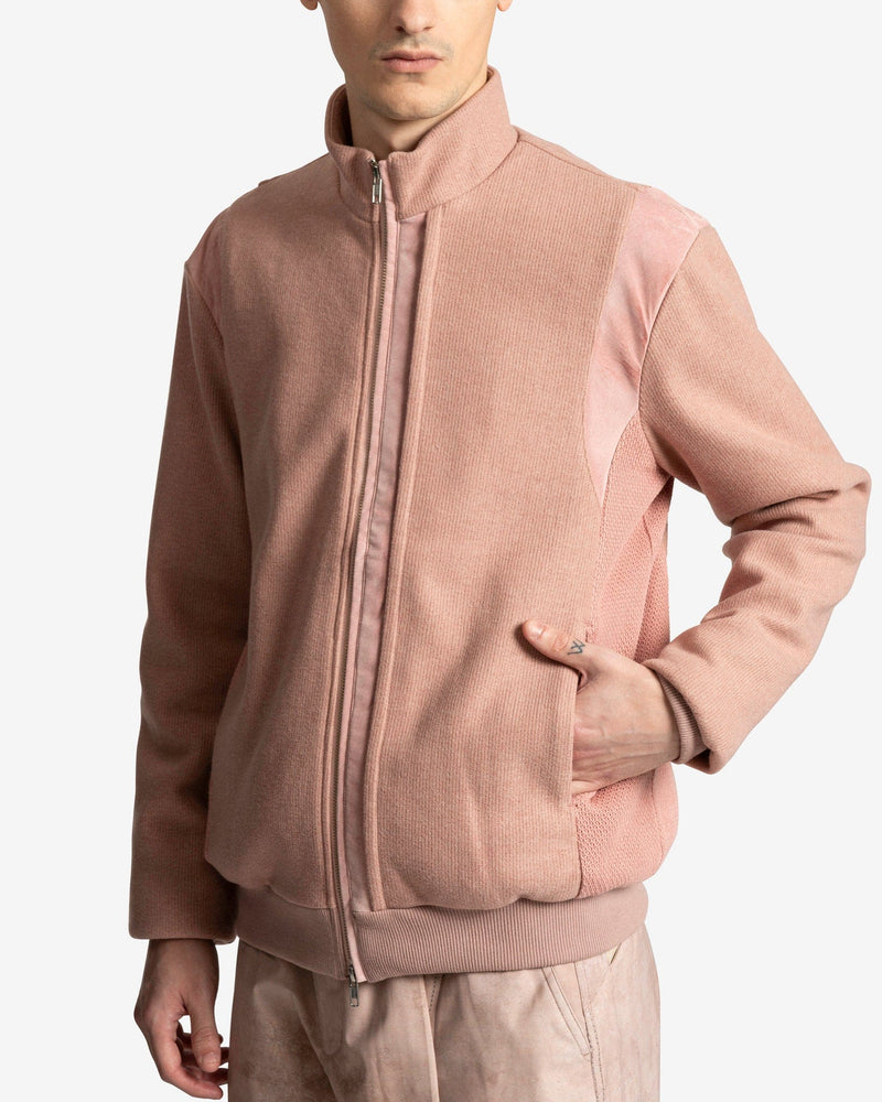 XLIM men's knit zip up in pink. This jacket features a stand collar, front zip closure and suede paneling.