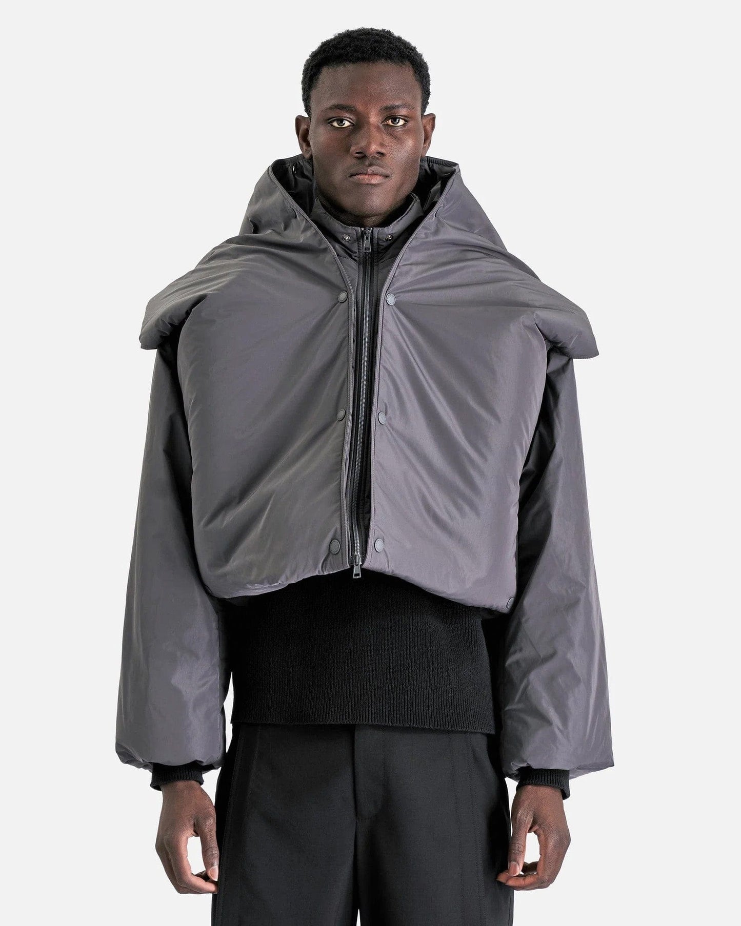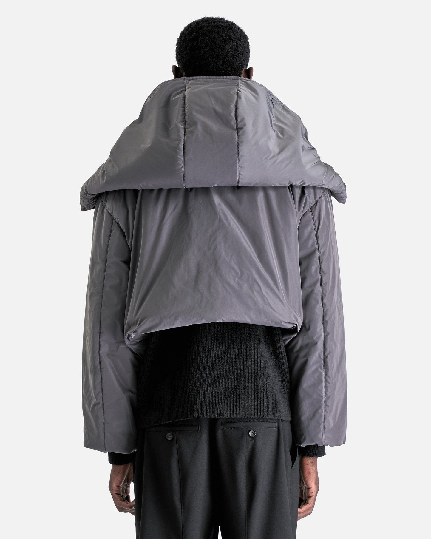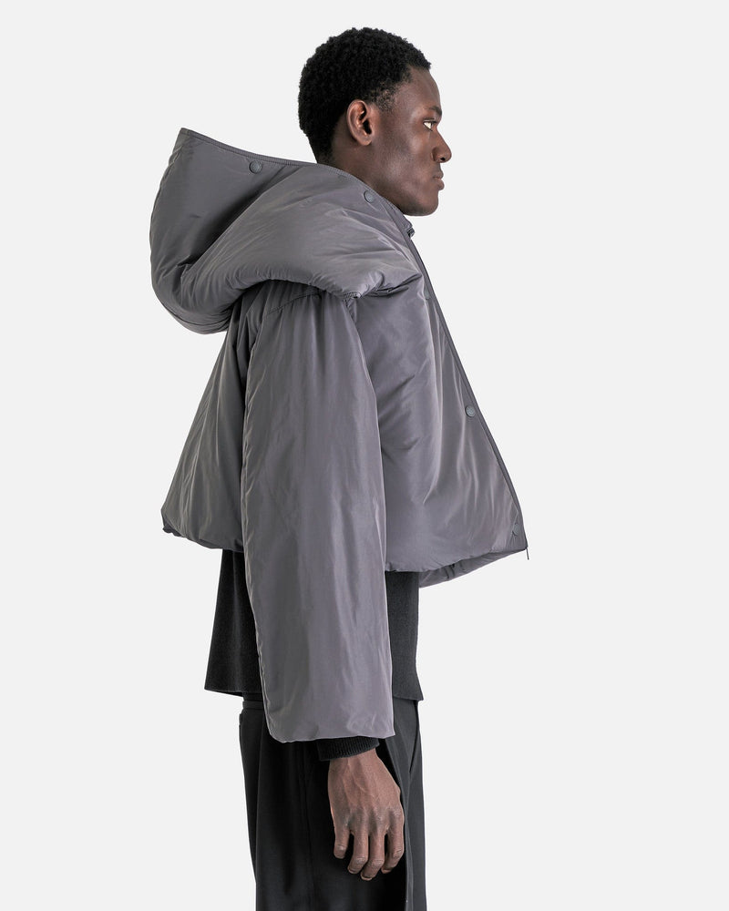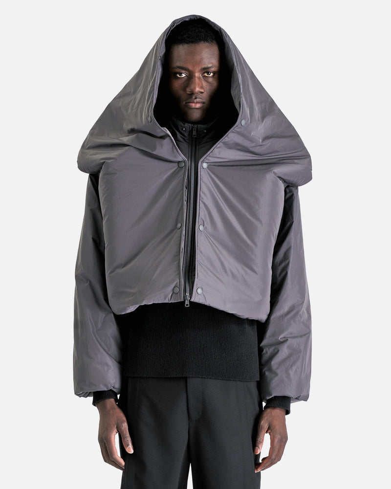 Y/Project Snap Off Panel Hood Cropped Puffer in Stone Grey. This puffer offers layered construction and features an integrated extended hood, stand collar, two-way zip closure, welt pockets and concealed bungee drawstring at cropped hem.