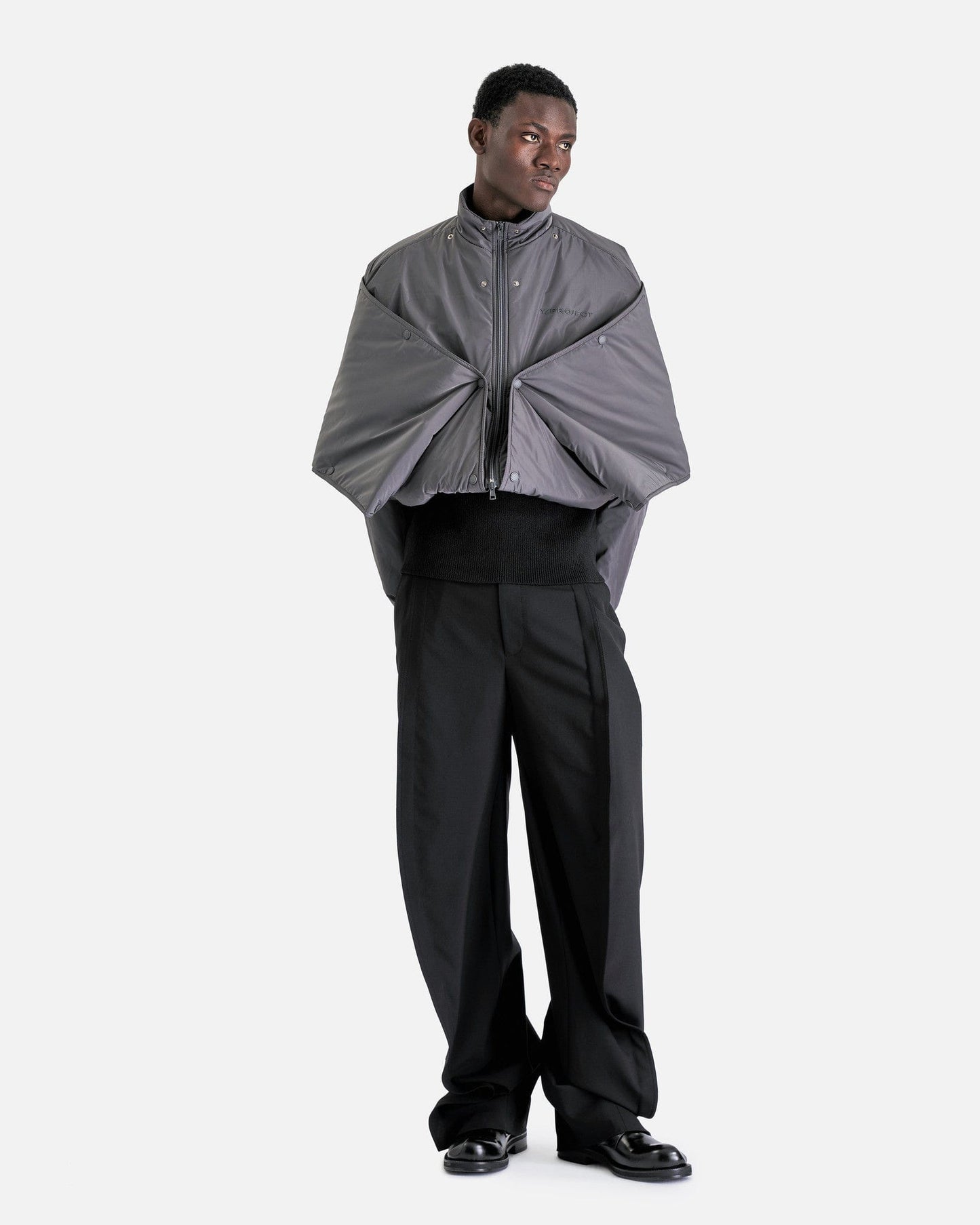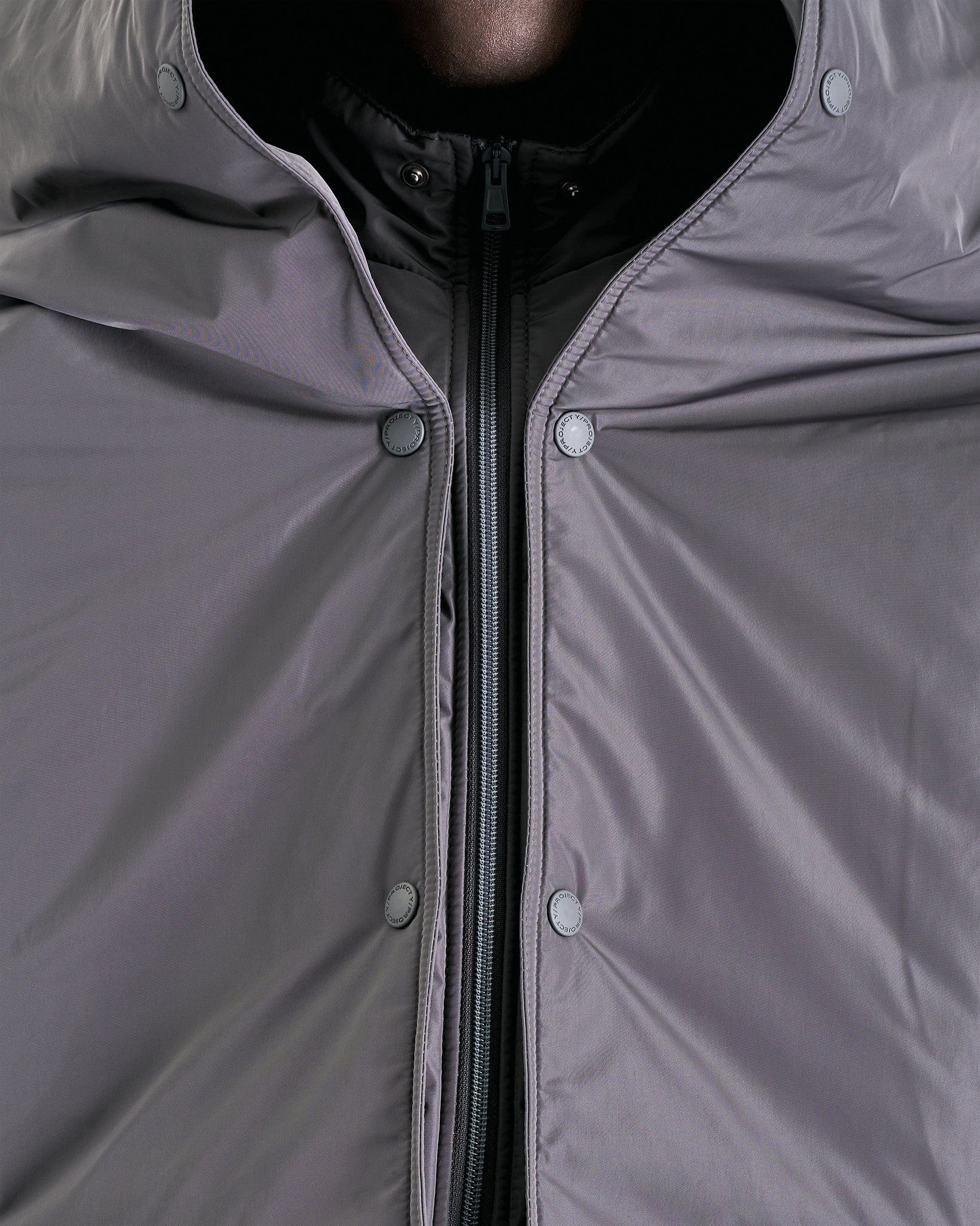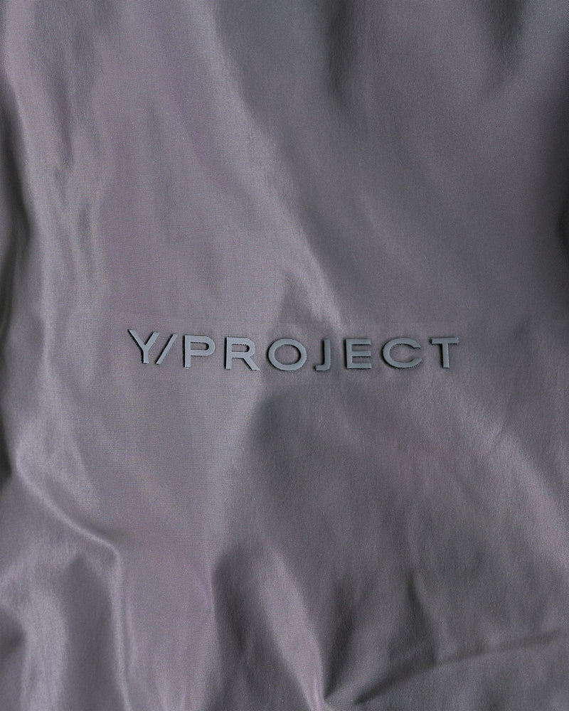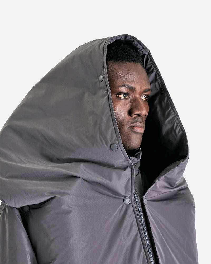 Y/Project Snap Off Panel Hood Cropped Puffer in Stone Grey. This puffer offers layered construction and features an integrated extended hood, stand collar, two-way zip closure, welt pockets and concealed bungee drawstring at cropped hem.