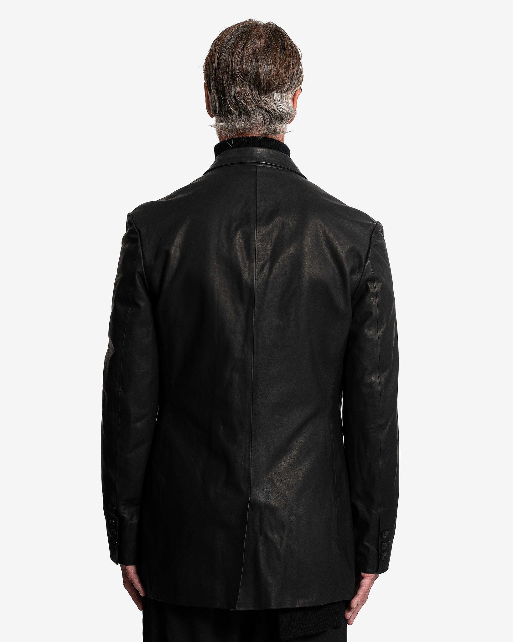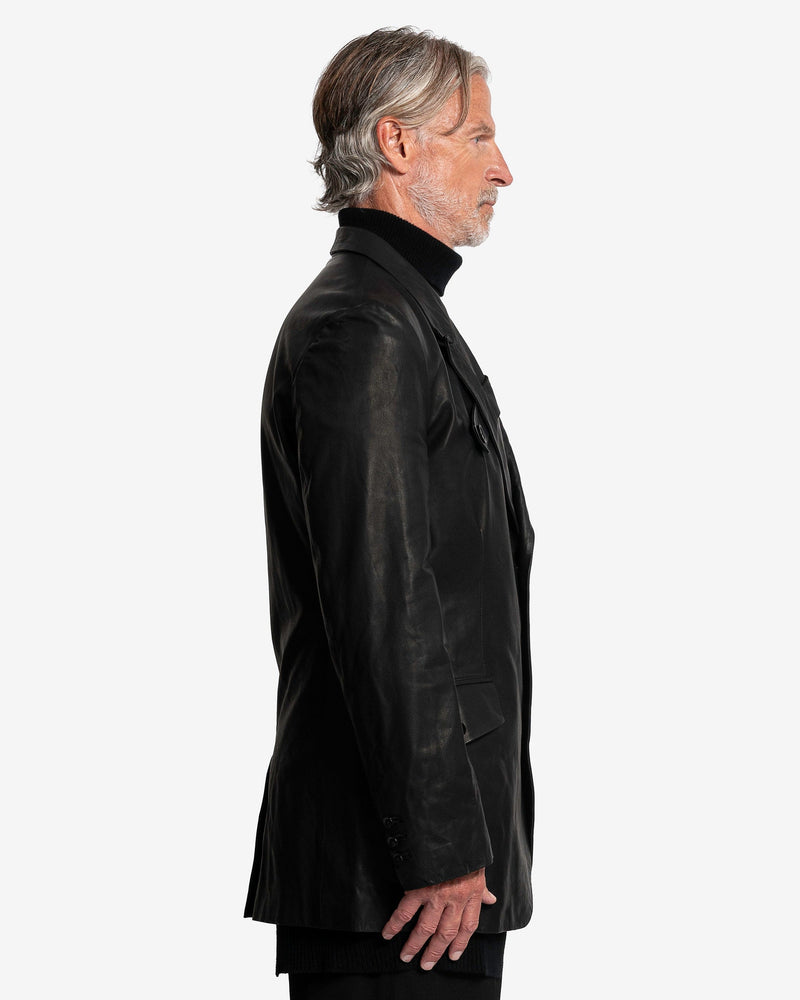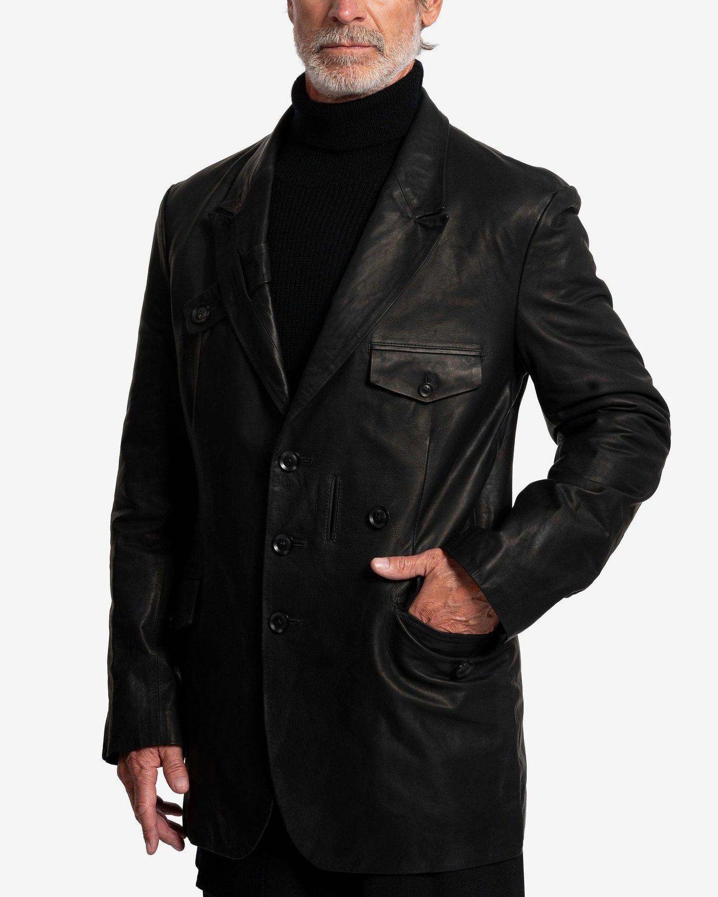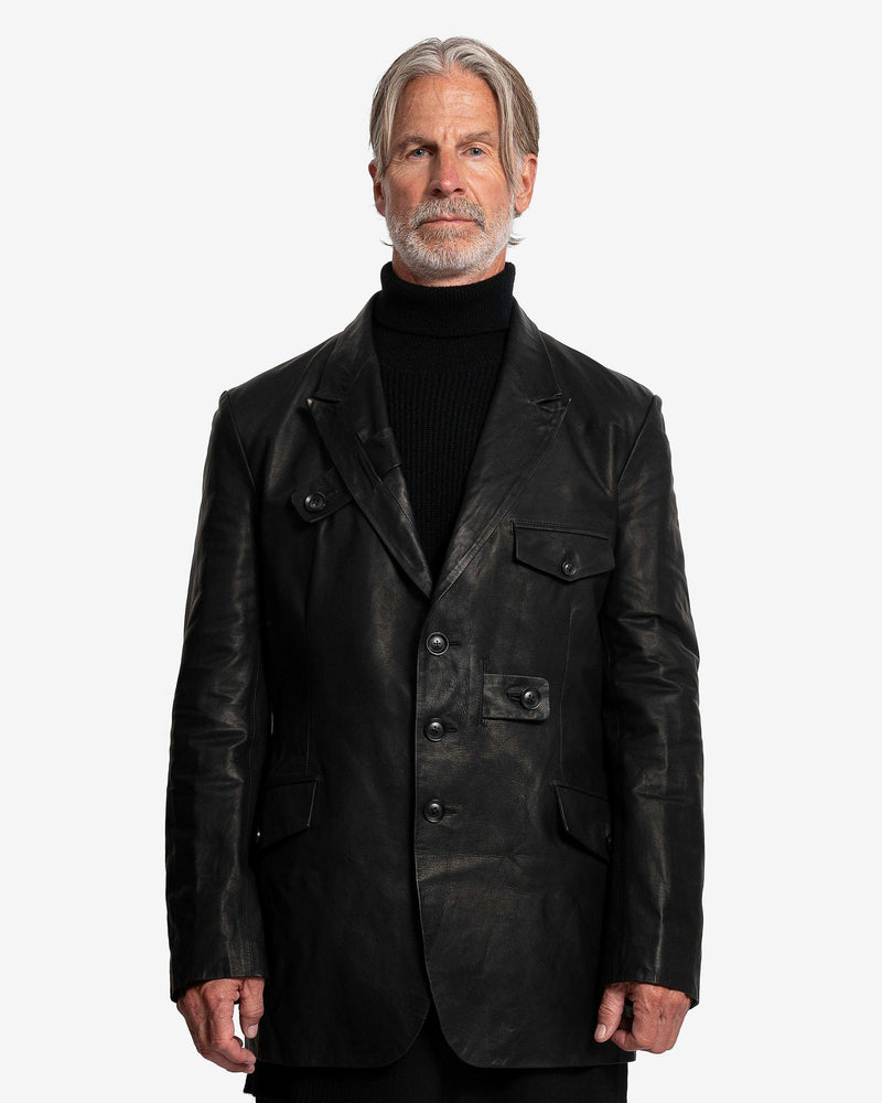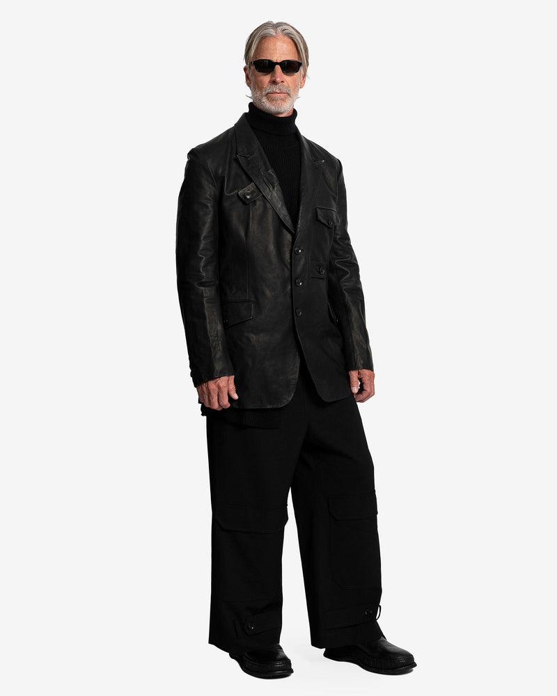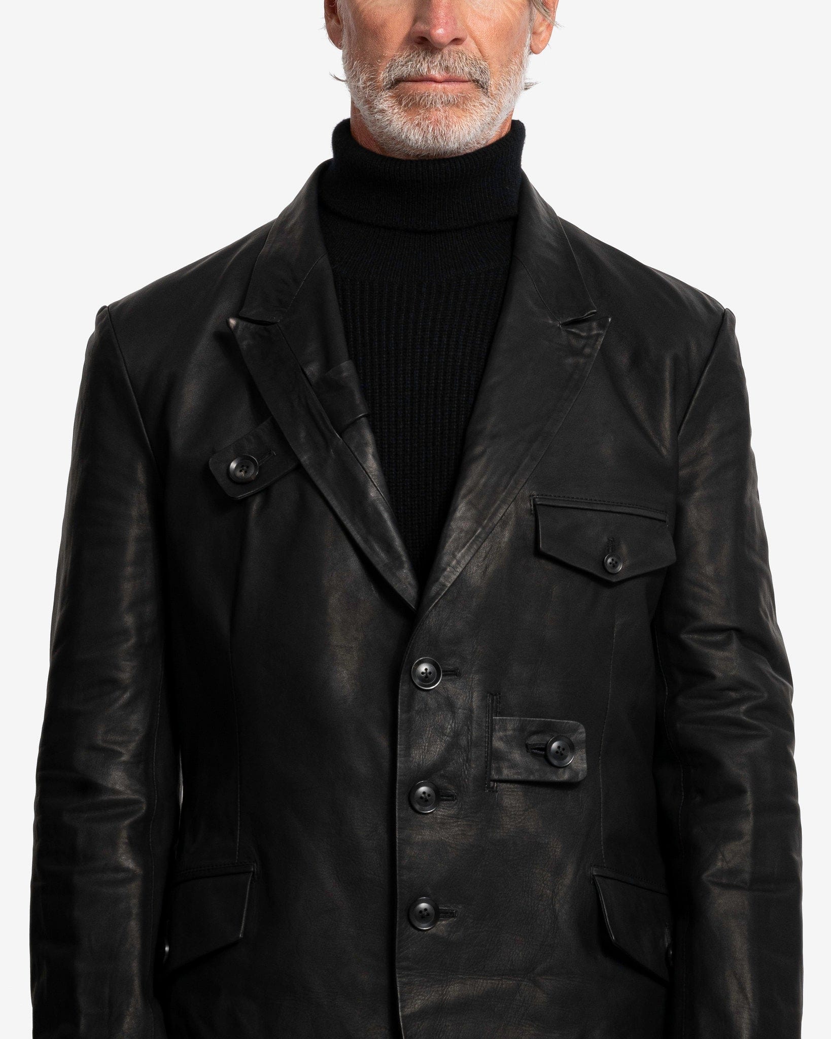 Yohji Yamamoto Pour Homme men's leather suit jacket in black. This jacket features a peaked lapel and buttoned tab details along the front.