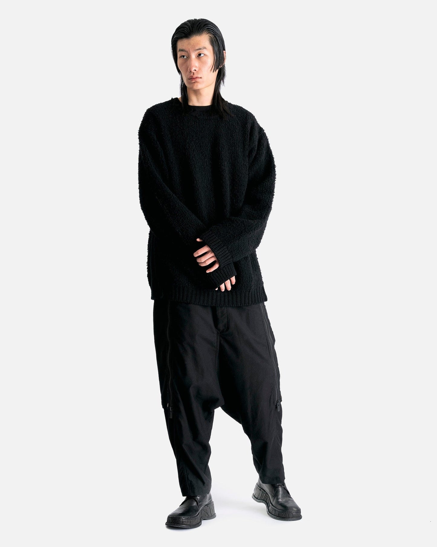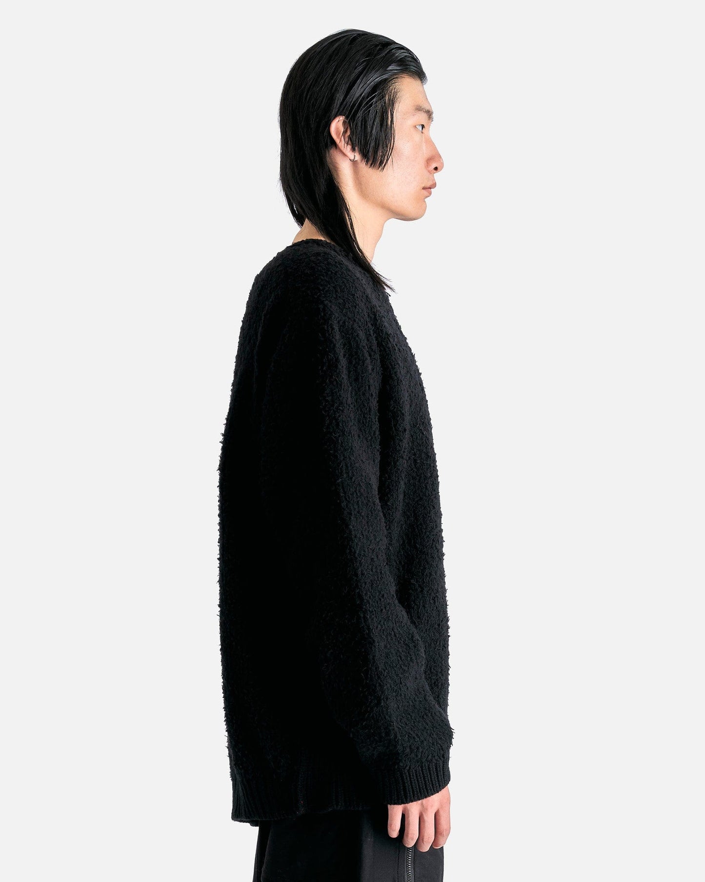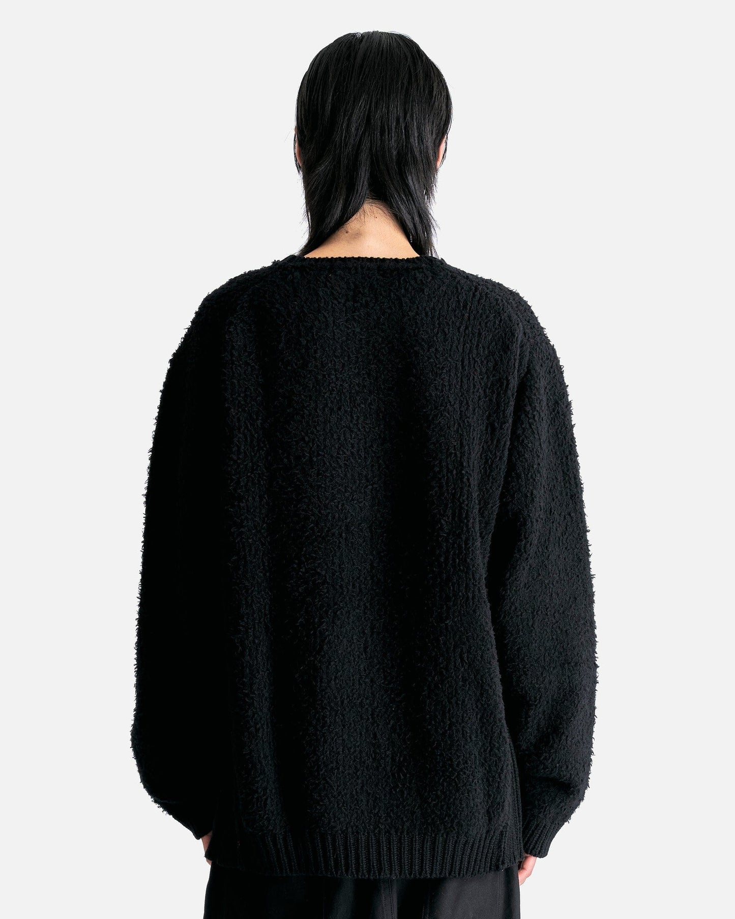 Yohji Yamamoto Pour Homme Notch Neck Side Rib in Black. This sweater features an allover light pilling, rib knit collar, cuffs, and hem, ribbing at underarms and dropped shoulder seams.