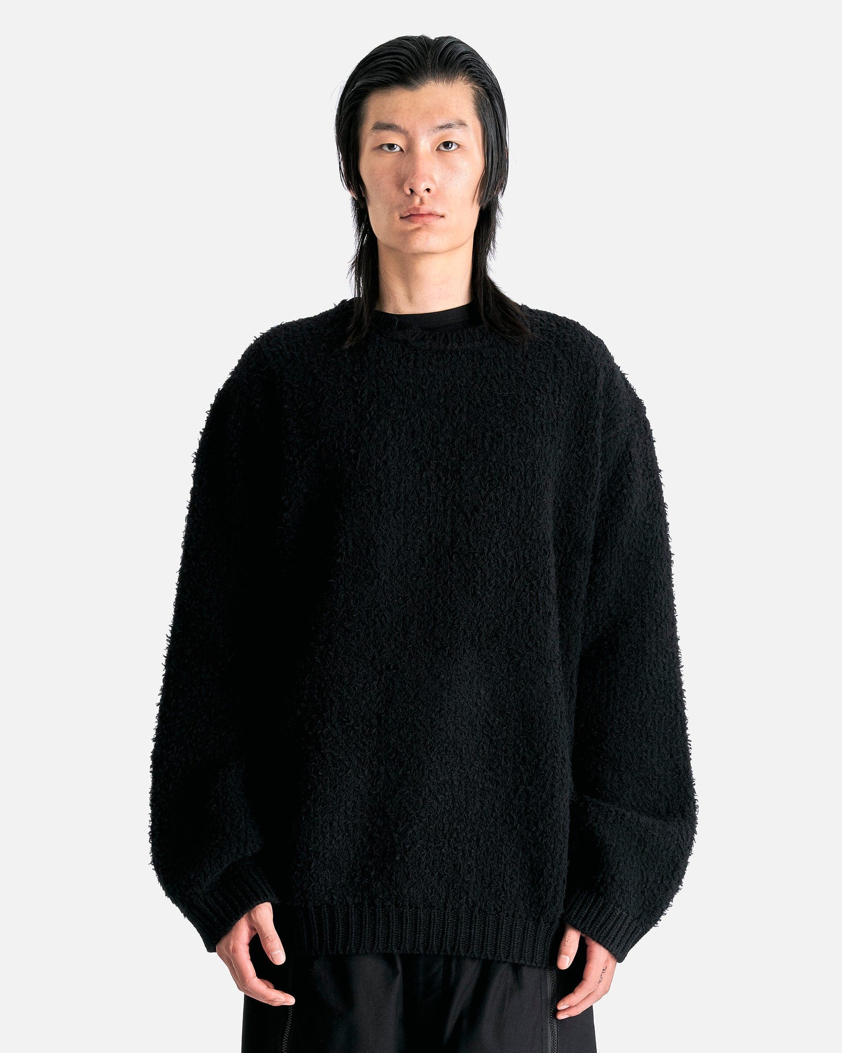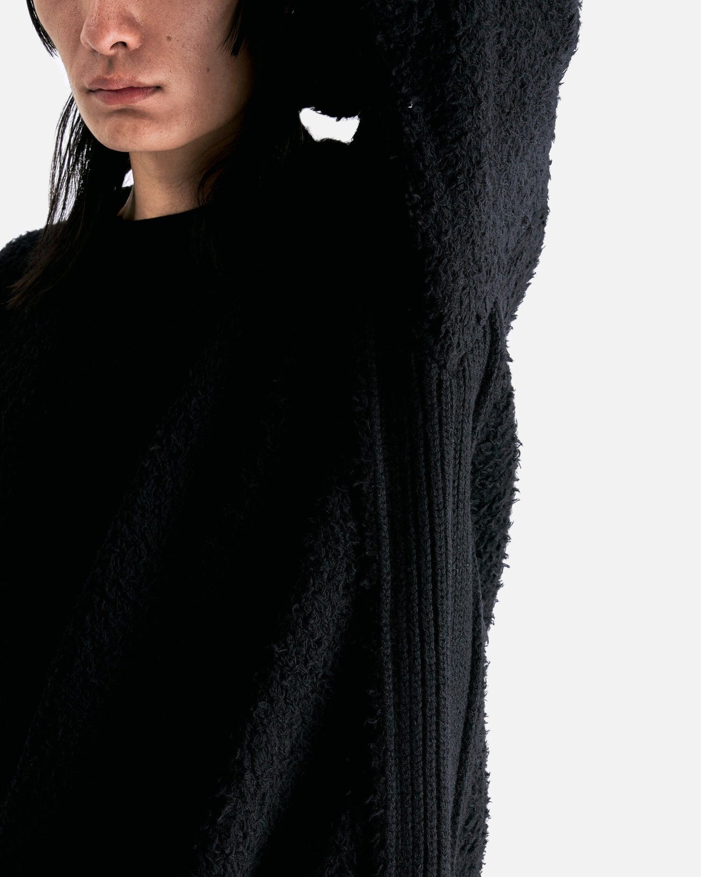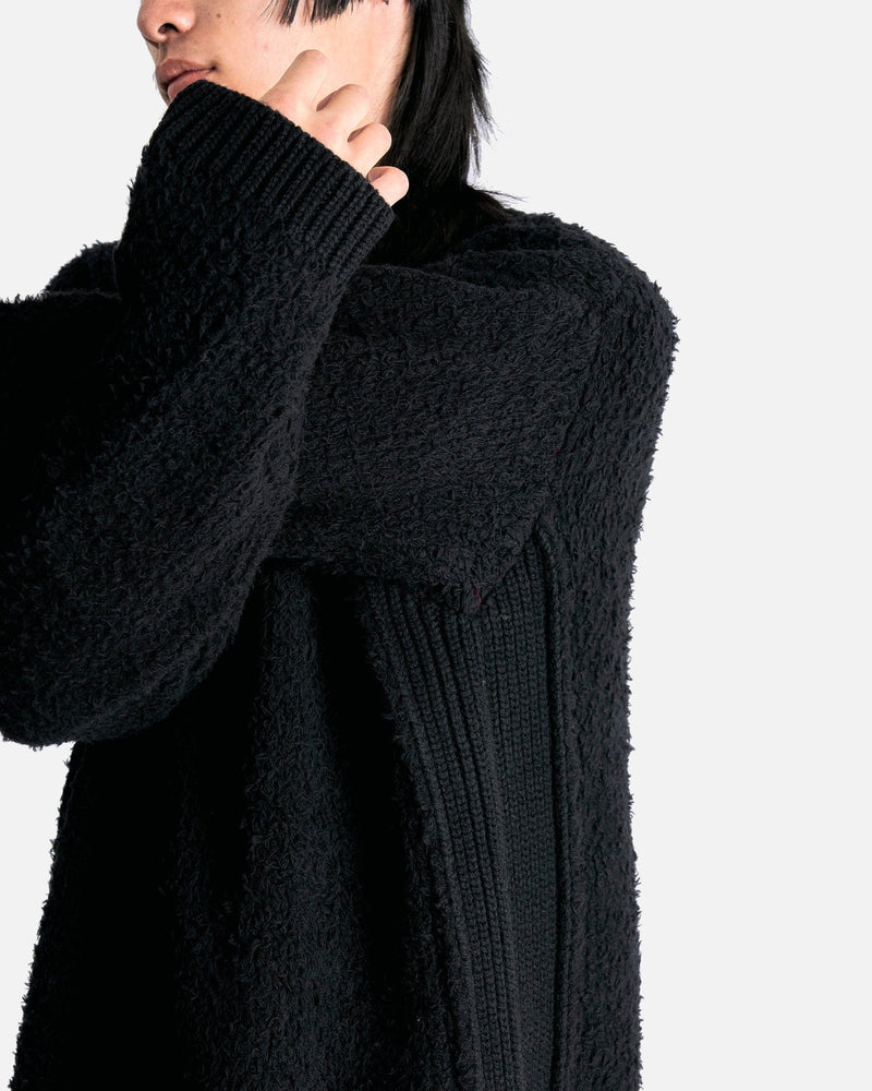 Yohji Yamamoto Pour Homme Notch Neck Side Rib in Black. This sweater features an allover light pilling, rib knit collar, cuffs, and hem, ribbing at underarms and dropped shoulder seams.