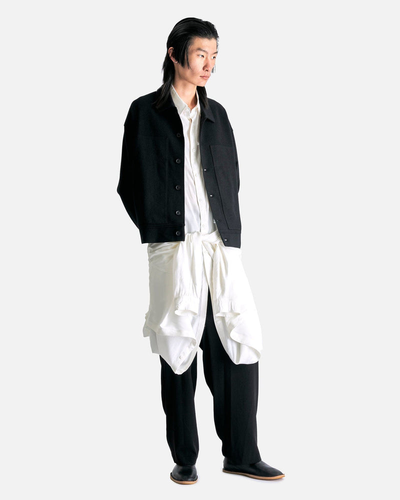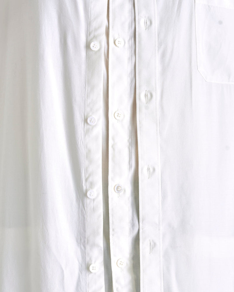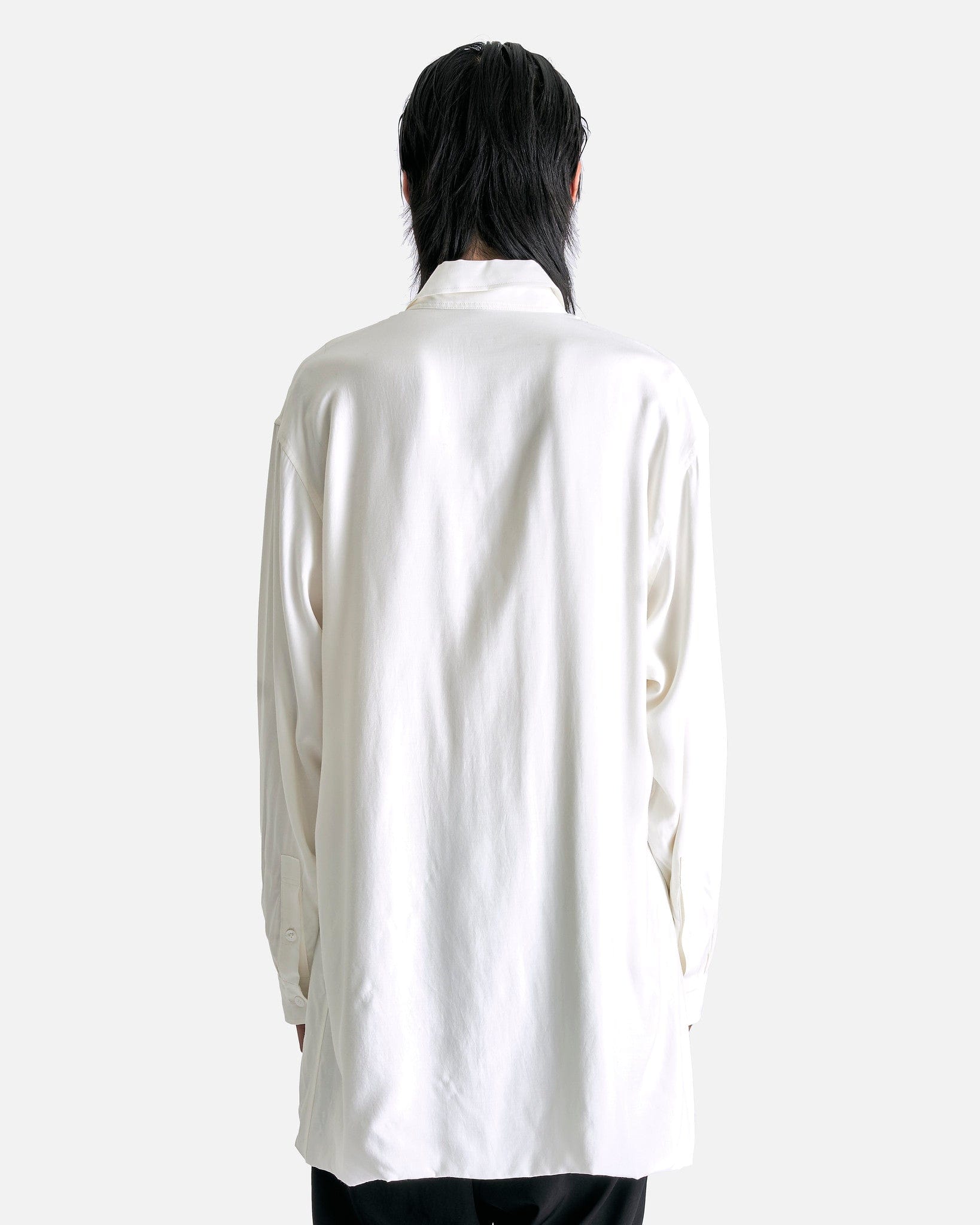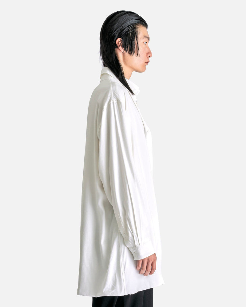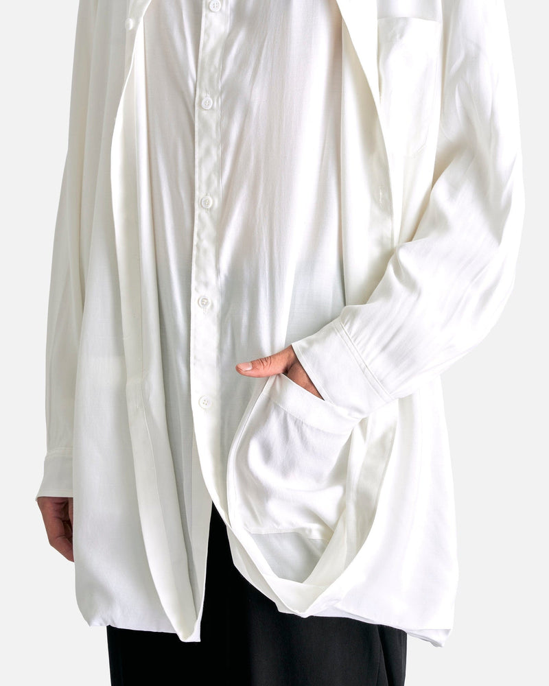 Yohji Yamamoto Pour Homme R-Double Hem Shirt in White. This garment acts as a double layer constructed shirt and features classic collars, button closures, patch pocket at the chest, interior pocket and balloon hem.