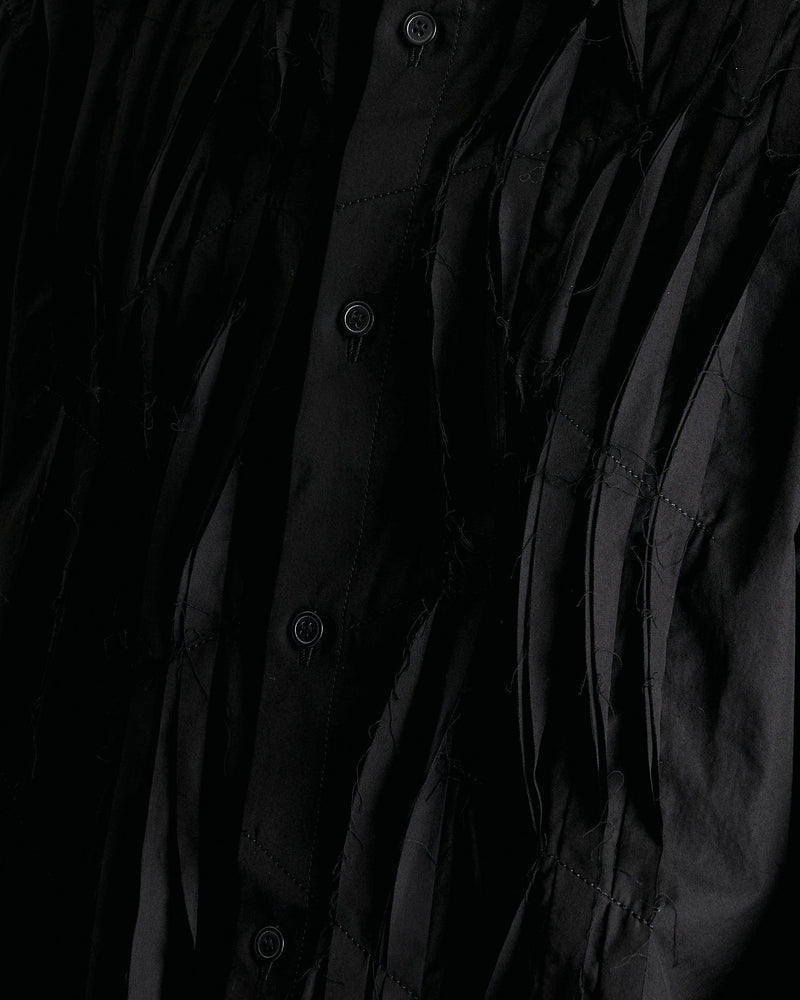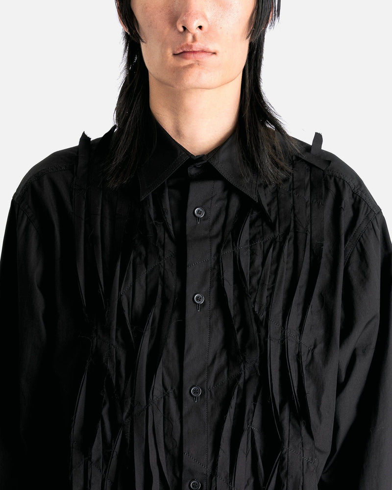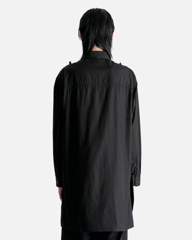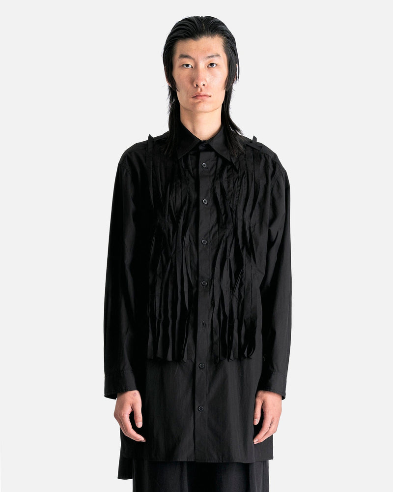 Yohji Yamamoto Pour Homme U-Chain Stitch B/ Cloth in Black. This shirt features a pointed collar, button closure, overlocked stitching on vertical fabric detailing at the front and side vents.