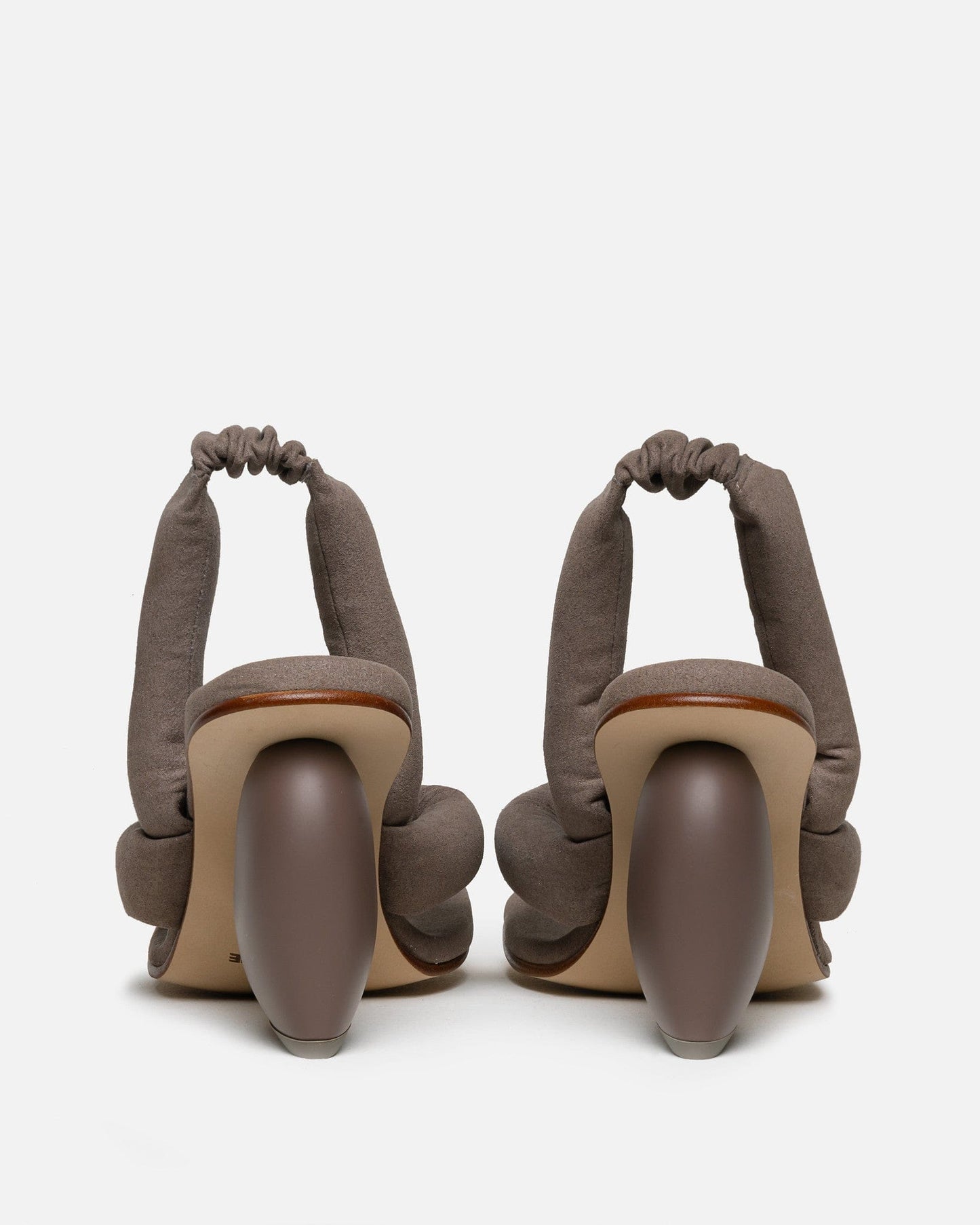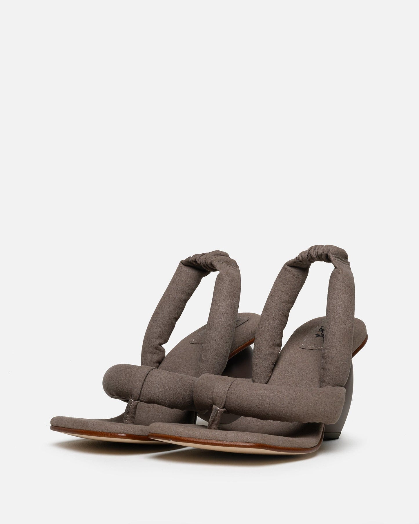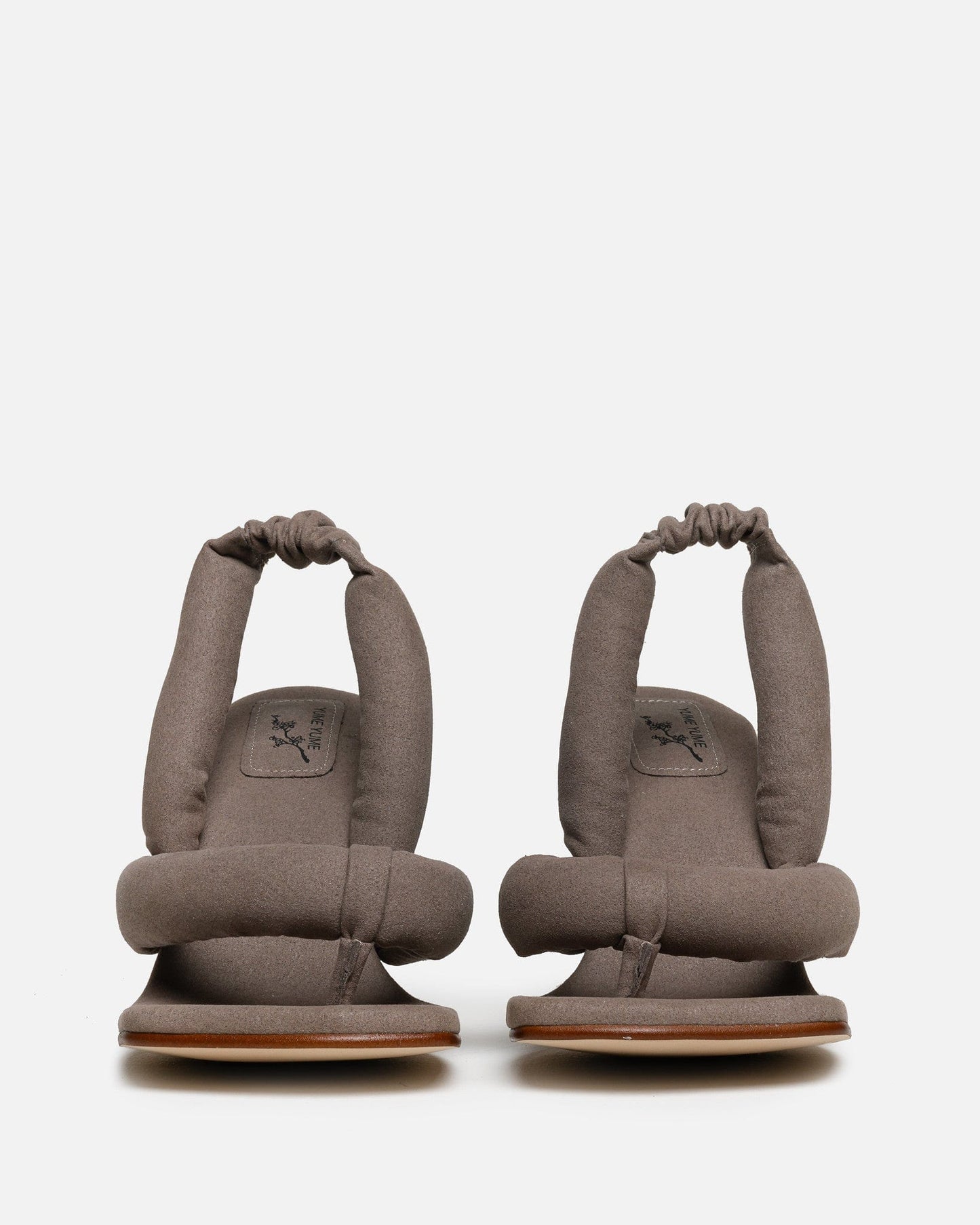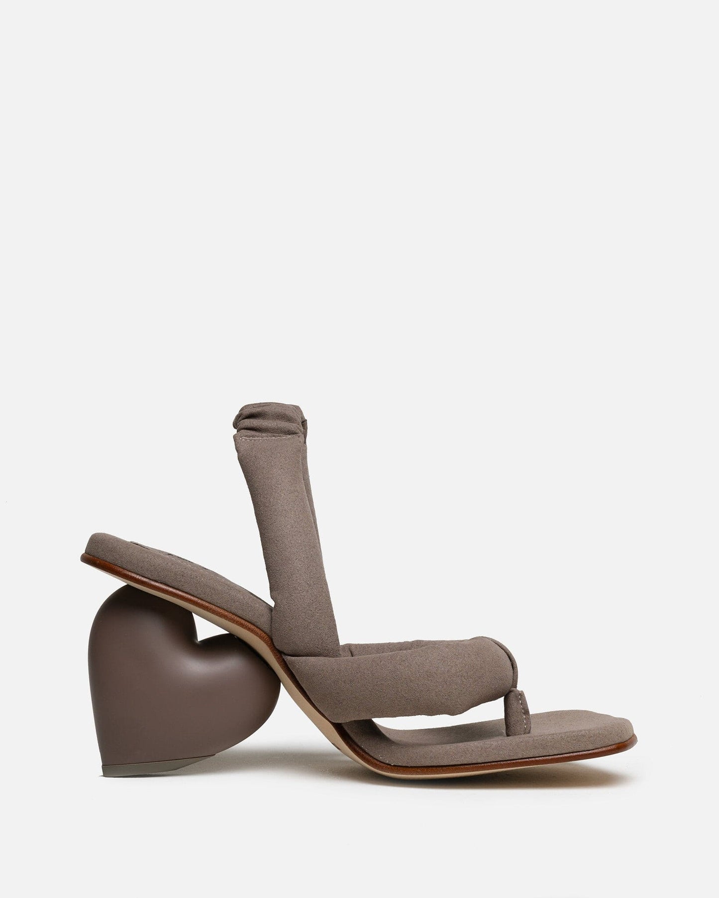 Yume Yume women's heart shaped heel in taupe suede. The Love Heel features a padded thong strap at the toe and a padded heel strap to hold the foot in.