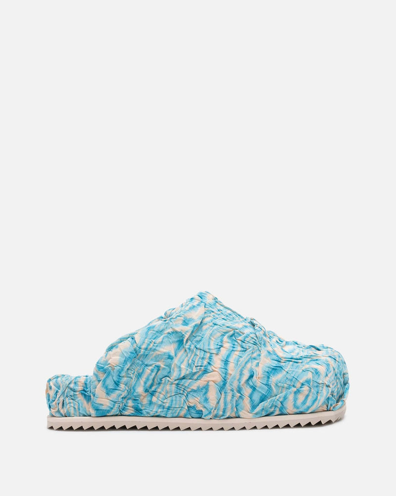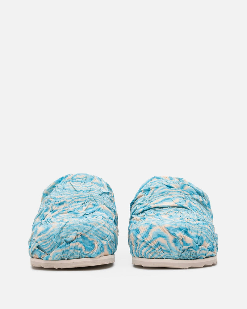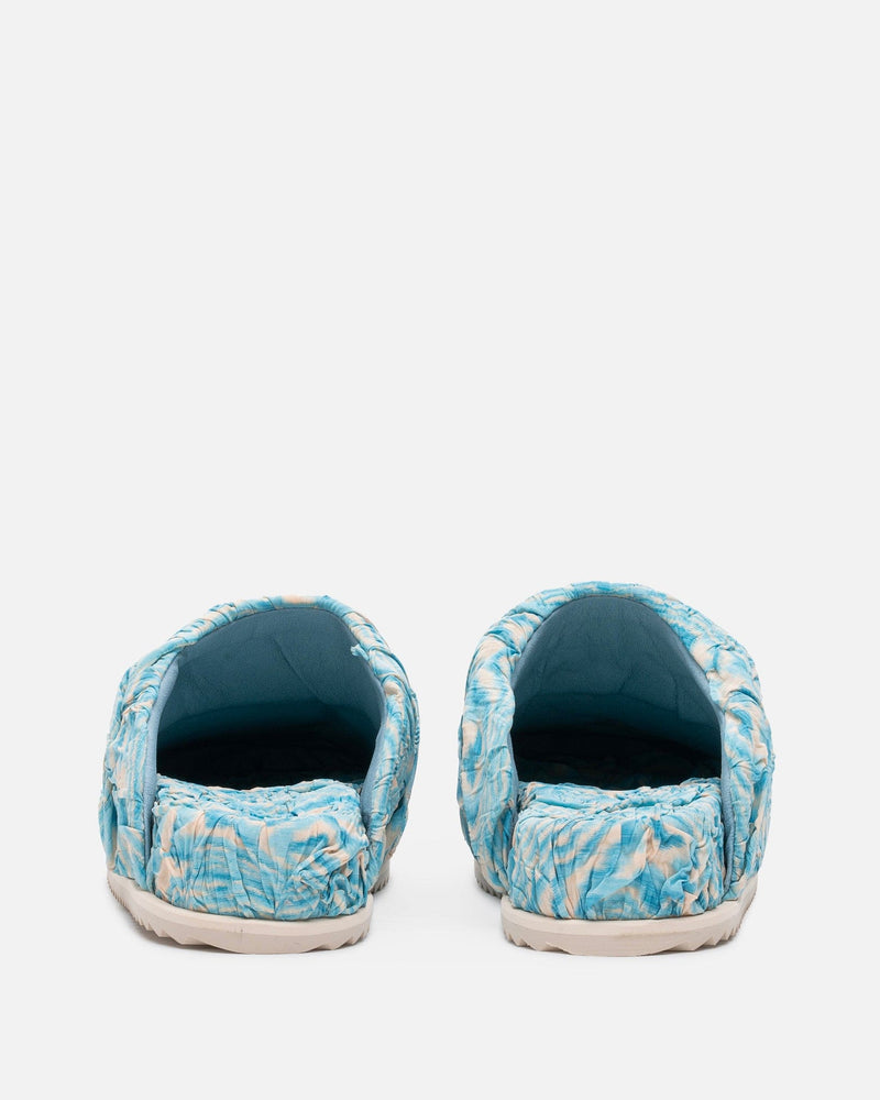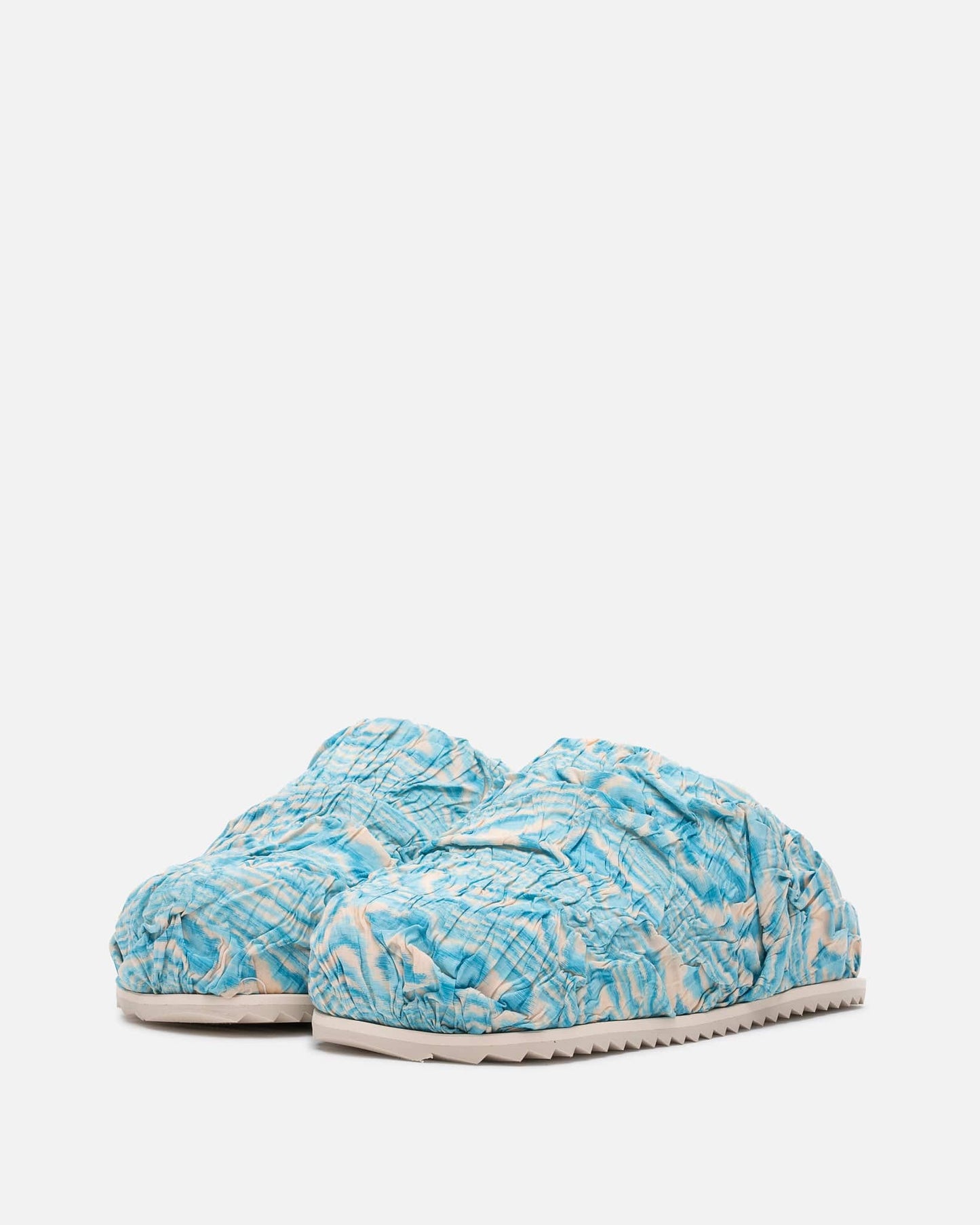 Yume Yume clogs in printed blue. These clogs have an easy slip-on design, with a square outsole. They have a wrinkled blue fabric outer layer.
